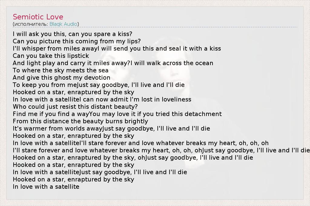 I will ask you this, can you spare a kiss? Can you picture this coming from my lips? I'll whisper from miles awayI will send you this and seal it with a kiss Can you take this lipstick And light play and carry it miles away?I will walk across the ocean To where the sky meets the sea And give this ghost my devotion To keep you from meJust say goodbye, I'll live and I'll die Hooked on a star, enraptured by the sky In love with a satelliteI can now admit I'm lost in loveliness Who could just resist this distant beauty? Find me if you find a wayYou may love it if you tried this detachment From this distance the beauty burns brightly It's warmer from worlds awayJust say goodbye, I'll live and I'll die Hooked on a star, enraptured by the sky In love with a satelliteI'll stare forever and love whatever breaks my heart, oh, oh, oh I'll stare forever and love whatever breaks my heart, oh, oh, ohJust say goodbye, I'll live and I'll die Hooked on a star, enraptured by the sky, ohJust say goodbye, I'll live and I'll die Hooked on a star, enraptured by the sky In love with a satelliteJust say goodbye, I'll live and I'll die Hooked on a star, enraptured by the sky In love with a satellite