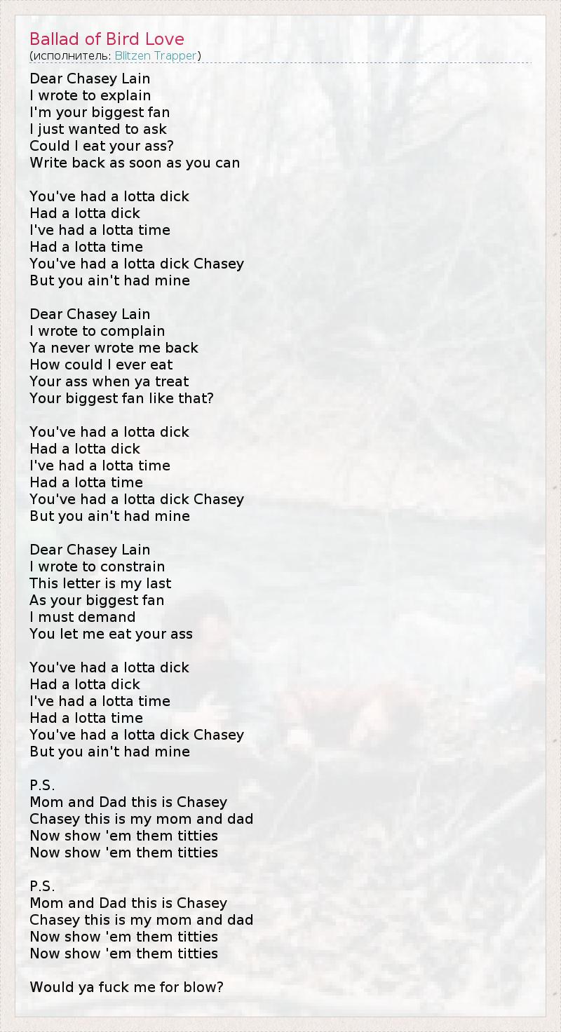 Дорогая Чейси Лейн Пишу объяснить, Что я твой большой фанат. Просто хочу спросить: Можно попробовать твой зад? Ответь как можно быстрей. У тебя было много ч*енов Много ч*енов, У меня было много времени Много времени У тебя было много ч*енов, Чейси, Но у тебя не было моего. Дорогая Чейси лейн, Пишу, чтоб пожаловаться: ТЫ мне так и не написала. Как же попробует твой зад, Когда ты поступаешь так с тем, кто Такой большой фанат? У тебя было много ч*енов Много ч*енов, У меня было много времени Много времени У тебя было много ч*енов, Чейси, Но у тебя не было моего. Дорогая Чейси лейн Я пишу сообщить, Что это мое последнее письмо. Как твой большой фанат Я должен потребовать, Чтобы ты дала мне попробовать свой зад. У тебя было много ч*енов Много ч*енов, У меня было много времени Много времени У тебя было много ч*енов, Чейси, Но у тебя не было моего. P.S. Мама и папа - это Чейси. Чейси - это мои мама и папа. А теперь покажи им сись*и! А теперь покажи им сись*и! P.S. Мама и папа - это Чейси. Чейси - это мои мама и папа. А теперь покажи им сись*и! А теперь покажи им сись*и! А ты тр****шь меня за "кокос"?