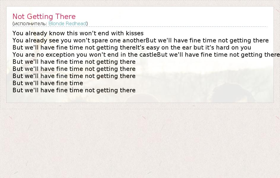 You already know this won't end with kisses You already see you won't spare one anotherBut we'll have fine time not getting there But we'll have fine time not getting thereIt's easy on the ear but it's hard on you You are no exception you won't end in the castleBut we'll have fine time not getting there But we'll have fine time not getting there But we'll have fine time not getting there But we'll have fine time not getting there But we'll have fine time But we'll have fine time not getting there