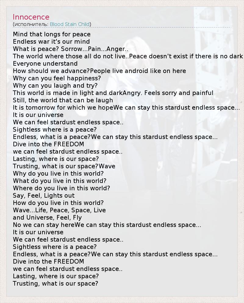 Mind that longs for peace Endless war it's our mind What is peace? Sorrow...Pain...Anger.. The world where those all do not live..Peace doesn't exist if there is no dark Everyone understand How should we advance?People live android like on here Why can you feel happiness? Why can you laugh and try? This world is made in light and darkAngry. Feels sorry and painful Still, the world that can be laugh It is tomorrow for which we hopeWe can stay this stardust endless space... It is our universe We can feel stardust endless space.. Sightless where is a peace? Endless, what is a peace?We can stay this stardust endless space... Dive into the FREEDOM we can feel stardust endless space.. Lasting, where is our space? Trusting, what is our space?Wave Why do you live in this world? What do you live in this world? Where do you live in this world? Say, Feel, Lights out How do you live in this world? Wave...Life, Peace, Space, Live and Universe, Feel, Fly No we can stay hereWe can stay this stardust endless space... It is our universe We can feel stardust endless space.. Sightless where is a peace? Endless, what is a peace?We can stay this stardust endless space... Dive into the FREEDOM we can feel stardust endless space.. Lasting, where is our space? Trusting, what is our space?