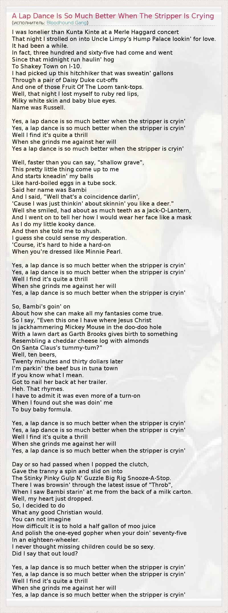 А как ты думаешь, о чем песня "A Lap Dance Is So Much Better When The Stripper Is Crying" ?