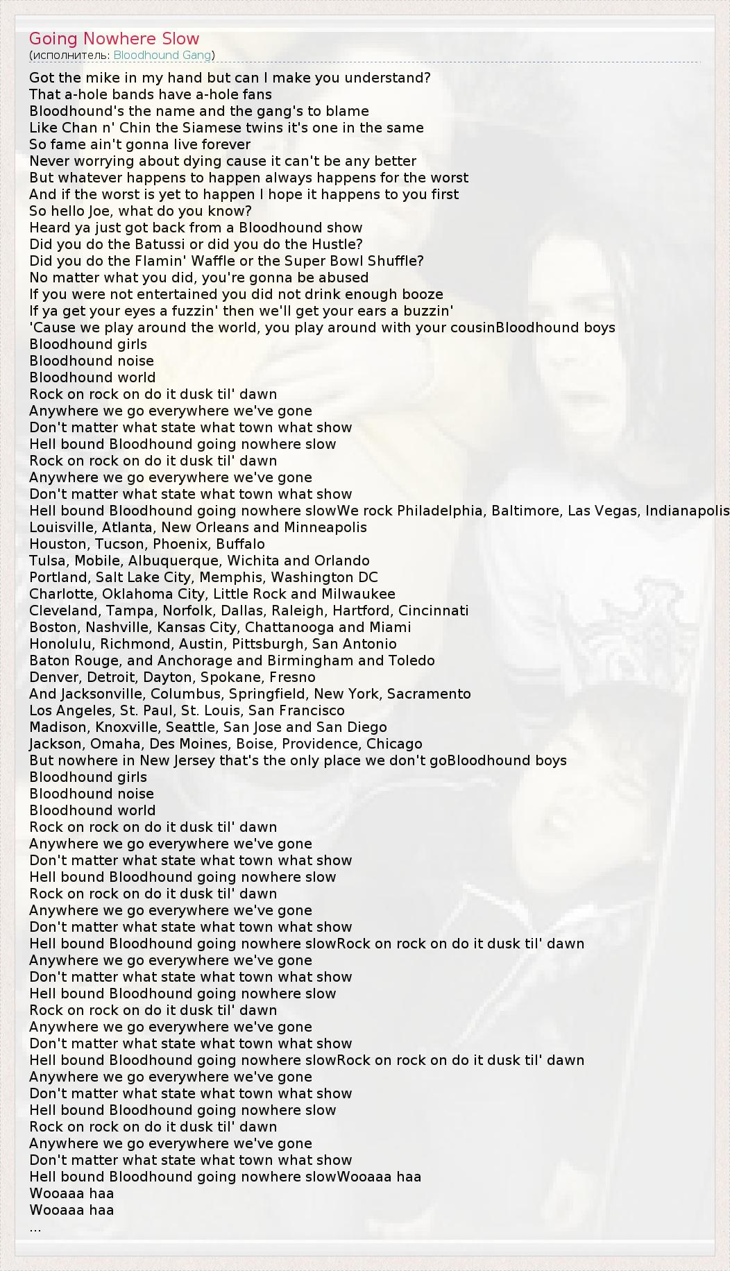 Hell bound Bloodhound going nowhere slowWe rock Philadelphia, Baltimore, Las Vegas, Indianapolis