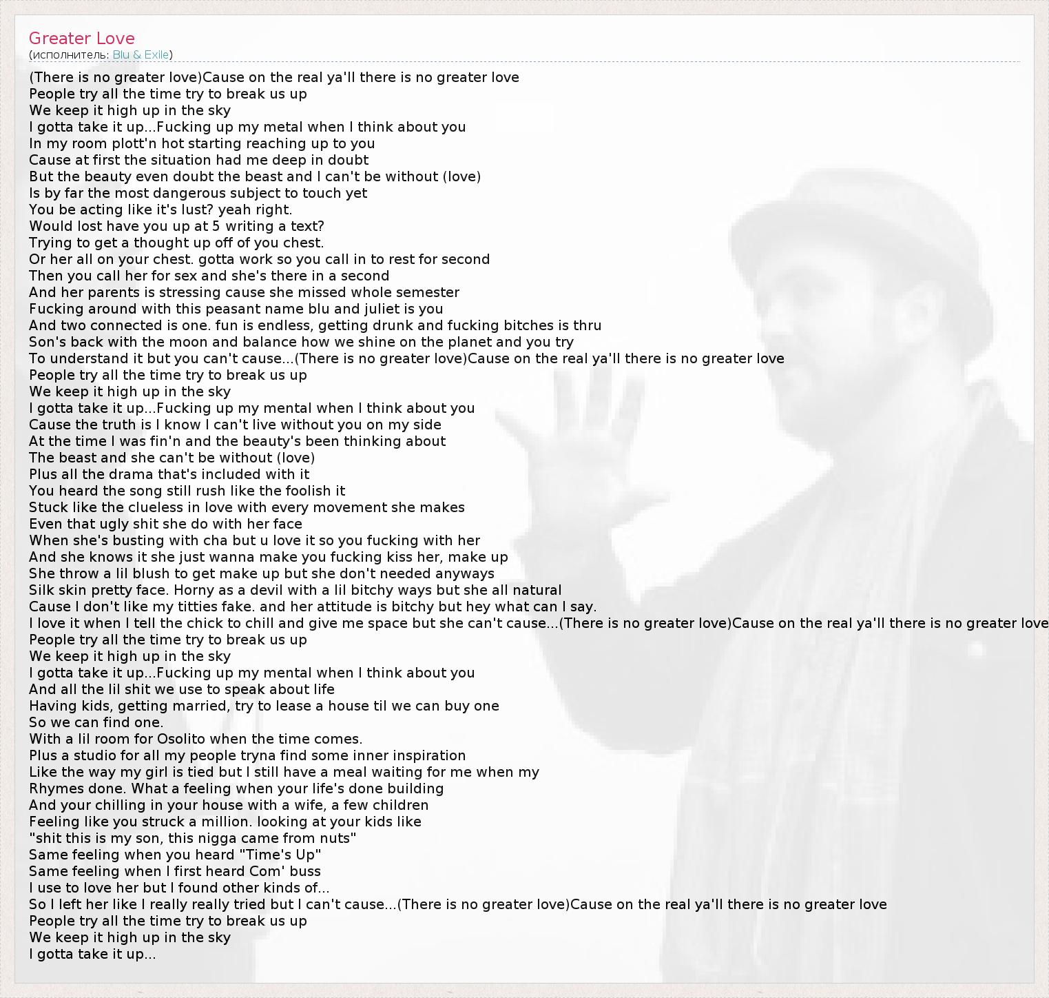 So I left her like I really really tried but I can't cause...(There is no greater love)Cause on the real ya'll there is no greater love