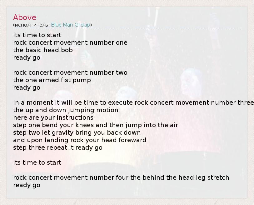 Это интересно:Blue Man Group — это невероятная смесь изобразительного искусства, науки, водевиля, игры на нестандартных ударных инструментах и искрометного юмора. Это не просто команда, а особенное явление в современной американской культуре. Участников этого нью-йоркского трио зовут Мeт Голдман, Фил Стантон и Крис Винк. Дебютный альбом группы «Audio» был номинирован на получение награды “Грэмми”... продолжение