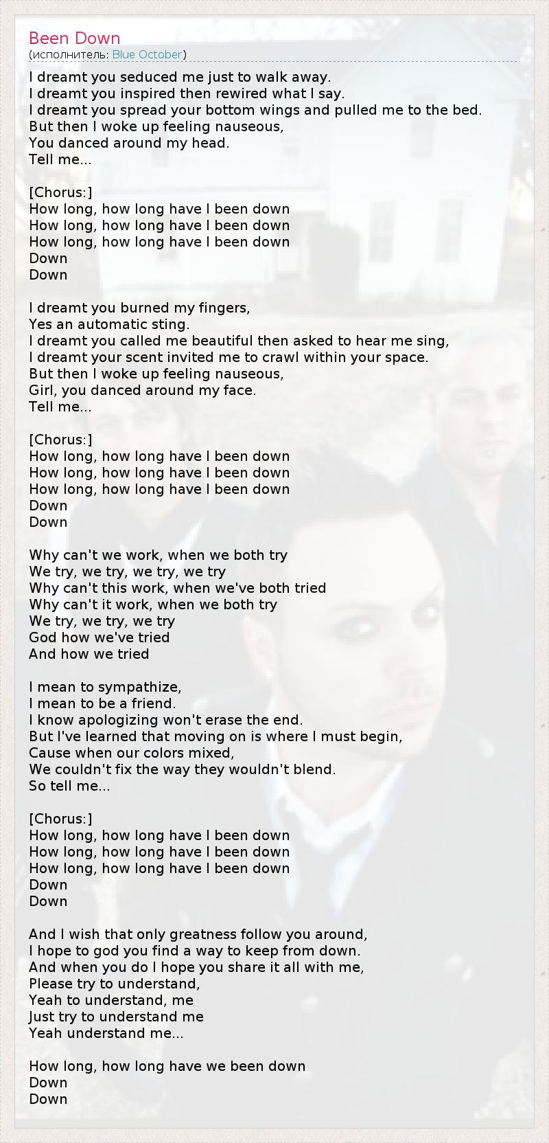 Список песен состоит из нескольких новых композиций, а также некоторых песен, которые Blue October и 5591 исполняли ранее на концертах. Например, концертная версия Weight of the World была включена в альбом Argue with a Tree…. Песня Say It была впервые исполнена 27 апреля 2008 года на «Edgefest». В тот день Стив Лиллиуайт впервые увидел выступление Blue October, а песня Say It побудила его стать продюсером следующего альбома группы. Во время выступлений 4 и 5 июля 2008 года Джастин Фёрстенфелд сказал, что Say It и Weight of the World появятся на новом альбоме. 23 июля во время веб-чата с поклонниками, Джастин сообщил, что на альбоме также появится песня Dirt Room, одна из новых песен и одна из любимых композиций самого музыканта. Она была впервые исполнена в декабре 2008 года, и через некоторое время стала первым синглом с альбома. Цифровой релиз состоялся 23 декабря 2008 года. Кроме того, две песни Blue Skies и My Never впервые были исполнены во время концертов в поддержку выхода книги Рассвет писательницы Стефани Майер. 7 января 2009 года группа выпустила песню Graceful Dancing в качестве подарка подписчикам новостей с официального сайта. Песня Kangaroo Cry была выпущена 10 февраля 2009 года в саундтреке к сериалу NCIS. Остальные песни были представлены во время концертов незадолго до выхода альбома.