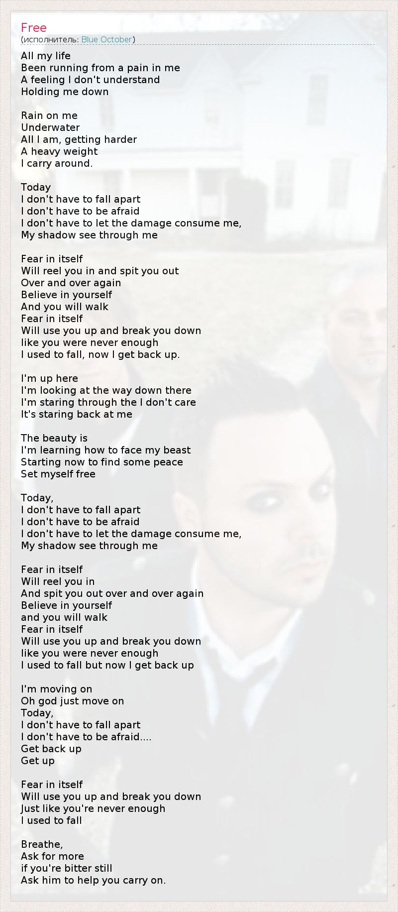 Это интересно:Blue October (с англ. — печальный октябрь) — американская группа из Хьюстона, штат Техас, играющая в стиле альтернативный рок. Группа создана в 1995 году и в настоящее время её коллектив составляют Джастин Фёрстенфелд (ведущий солист, ритм-гитара), Джереми Фёрстенфелд (барабаны, перкуссия), Райан Делахуси (скрипка, виолончель, мандолина, фортепиано, бэк-вокал) и Мэтт Новески (бас-гитара, бэк-вокал).Создание... продолжение