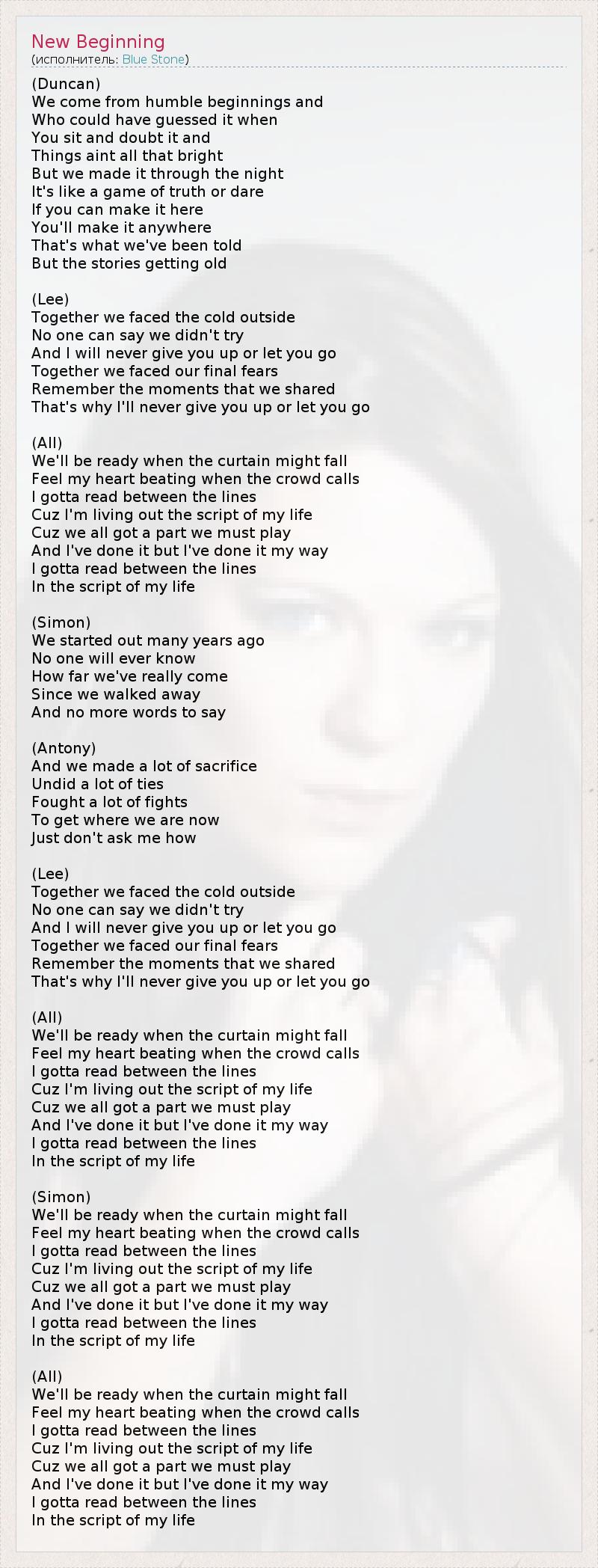 (Duncan) We come from humble beginnings and Who could have guessed it when You sit and doubt it and Things aint all that bright But we made it through the night It's like a game of truth or dare If you can make it here You'll make it anywhere That's what we've been told But the stories getting old (Lee) Together we faced the cold outside No one can say we didn't try And I will never give you up or let you go Together we faced our final fears Remember the moments that we shared That's why I'll never give you up or let you go (All) We'll be ready when the curtain might fall Feel my heart beating when the crowd calls I gotta read between the lines Cuz I'm living out the script of my life Cuz we all got a part we must play And I've done it but I've done it my way I gotta read between the lines In the script of my life (Simon) We started out many years ago No one will ever know How far we've really come Since we walked away And no more words to say (Antony) And we made a lot of sacrifice Undid a lot of ties Fought a lot of fights To get where we are now Just don't ask me how (Lee) Together we faced the cold outside No one can say we didn't try And I will never give you up or let you go Together we faced our final fears Remember the moments that we shared That's why I'll never give you up or let you go (All) We'll be ready when the curtain might fall Feel my heart beating when the crowd calls I gotta read between the lines Cuz I'm living out the script of my life Cuz we all got a part we must play And I've done it but I've done it my way I gotta read between the lines In the script of my life (Simon) We'll be ready when the curtain might fall Feel my heart beating when the crowd calls I gotta read between the lines Cuz I'm living out the script of my life Cuz we all got a part we must play And I've done it but I've done it my way I gotta read between the lines In the script of my life (All) We'll be ready when the curtain might fall Feel my heart beating when the crowd calls I gotta read between the lines Cuz I'm living out the script of my life Cuz we all got a part we must play And I've done it but I've done it my way I gotta read between the lines In the script of my life