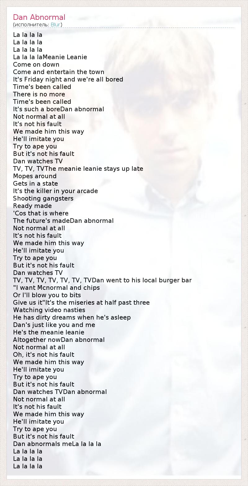 La la la la La la la la La la la la La la la laMeanie Leanie Come on down Come and entertain the town It's Friday night and we're all bored Time's been called There is no more Time's been called It's such a boreDan abnormal Not normal at all It's not his fault We made him this way He'll imitate you Try to ape you But it's not his fault Dan watches TV TV, TV, TVThe meanie leanie stays up late Mopes around Gets in a state It's the killer in your arcade Shooting gangsters Ready made 'Cos that is where The future's madeDan abnormal Not normal at all It's not his fault We made him this way He'll imitate you Try to ape you But it's not his fault Dan watches TV TV, TV, TV, TV, TV, TV, TVDan went to his local burger bar "I want Mcnormal and chips Or I'll blow you to bits Give us it"It's the miseries at half past three Watching video nasties He has dirty dreams when he's asleep Dan's just like you and me He's the meanie leanie Altogether nowDan abnormal Not normal at all Oh, it's not his fault We made him this way He'll imitate you Try to ape you But it's not his fault Dan watches TVDan abnormal Not normal at all It's not his fault We made him this way He'll imitate you Try to ape you But it's not his fault Dan abnormals meLa la la la La la la la La la la la La la la la