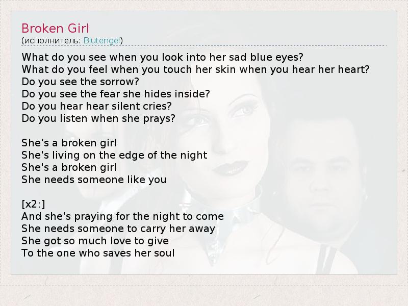 Что ты видишь в ее печальных голубых глазах? Что чувствуешь, касаясь ее кожи, ощущая биение ее сердца? Ты видишь ее печаль и боль? Ты видишь страх, который она прячет в себе? Ты слышишь ее беззвучные крики? Ты слушаешь ее молитвы? Она сломленная девушка, Она живет на границе ночи. Она сломленная девушка, Ей нужен кто-то, подобный тебе. [x2:] Она молит о приходе ночи. Ей нужен кто-то, кто заберет ее отсюда. В ней столько любви, которую она может отдать Тому, кто спасет ее душу.