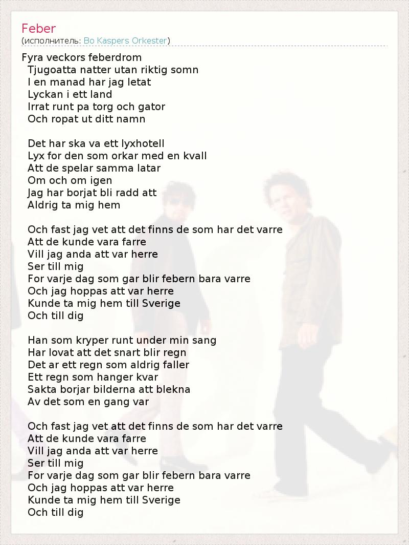 Fyra veckors feberdrom Tjugoatta natter utan riktig somn I en manad har jag letat Lyckan i ett land Irrat runt pa torg och gator Och ropat ut ditt namn Det har ska va ett lyxhotell Lyx for den som orkar med en kvall Att de spelar samma latar Om och om igen Jag har borjat bli radd att Aldrig ta mig hem Och fast jag vet att det finns de som har det varre Att de kunde vara farre Vill jag anda att var herre Ser till mig For varje dag som gar blir febern bara varre Och jag hoppas att var herre Kunde ta mig hem till Sverige Och till dig Han som kryper runt under min sang Har lovat att det snart blir regn Det ar ett regn som aldrig faller Ett regn som hanger kvar Sakta borjar bilderna att blekna Av det som en gang var Och fast jag vet att det finns de som har det varre Att de kunde vara farre Vill jag anda att var herre Ser till mig For varje dag som gar blir febern bara varre Och jag hoppas att var herre Kunde ta mig hem till Sverige Och till dig