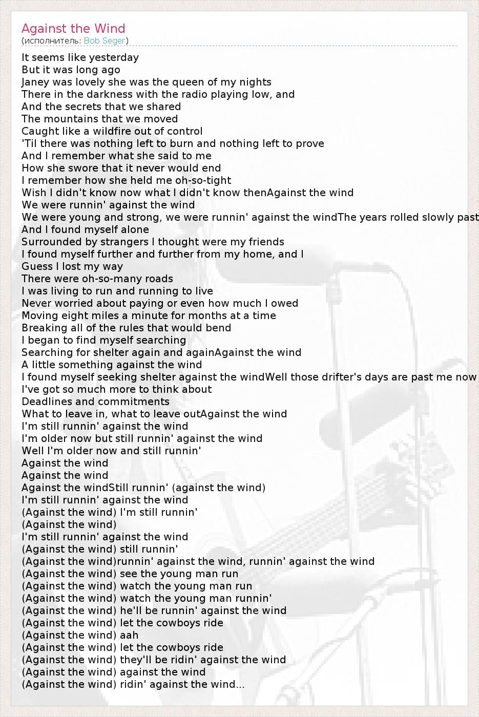 А как ты думаешь, о чем песня "Against the Wind" ?