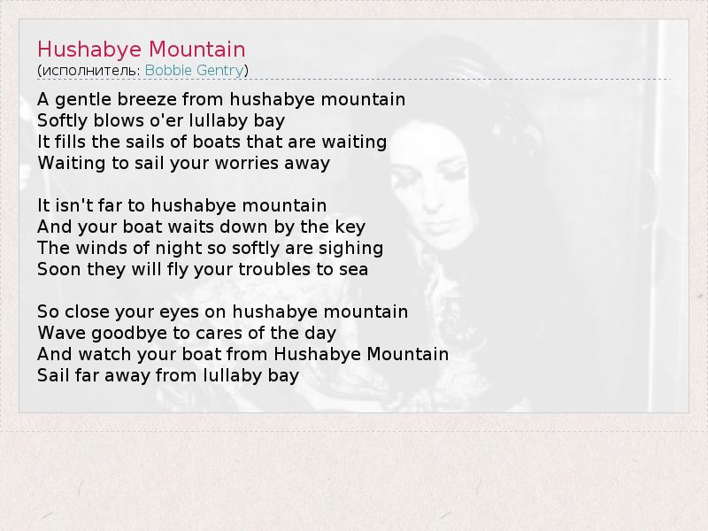 A gentle breeze from hushabye mountain Softly blows o'er lullaby bay It fills the sails of boats that are waiting Waiting to sail your worries away It isn't far to hushabye mountain And your boat waits down by the key The winds of night so softly are sighing Soon they will fly your troubles to sea So close your eyes on hushabye mountain Wave goodbye to cares of the day And watch your boat from Hushabye Mountain Sail far away from lullaby bay