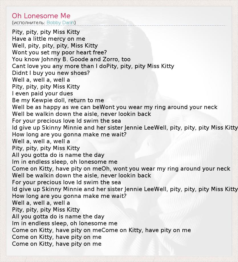 Pity, pity, pity Miss Kitty Have a little mercy on me Well, pity, pity, pity, Miss Kitty Wont you set my poor heart free? You know Johnny B. Goode and Zorro, too Cant love you any more than I doPity, pity, pity Miss Kitty Didnt I buy you new shoes? Well a, well a, well a Pity, pity, pity Miss Kitty I even paid your dues Be my Kewpie doll, return to me Well be as happy as we can beWont you wear my ring around your neck Well be walkin down the aisle, never lookin back For your precious love Id swim the sea Id give up Skinny Minnie and her sister Jennie LeeWell, pity, pity, pity Miss Kitty How long are you gonna make me wait? Well a, well a, well a Pity, pity, pity Miss Kitty All you gotta do is name the day Im in endless sleep, oh lonesome me Come on Kitty, have pity on meOh, wont you wear my ring around your neck Well be walkin down the aisle, never lookin back For your precious love Id swim the sea Id give up Skinny Minnie and her sister Jennie LeeWell, pity, pity, pity Miss Kitty How long are you gonna make me wait? Well a, well a, well a Pity, pity, pity Miss Kitty All you gotta do is name the day Im in endless sleep, oh lonesome me Come on Kitty, have pity on meCome on Kitty, have pity on me Come on Kitty, have pity on me Come on Kitty, have pity on me