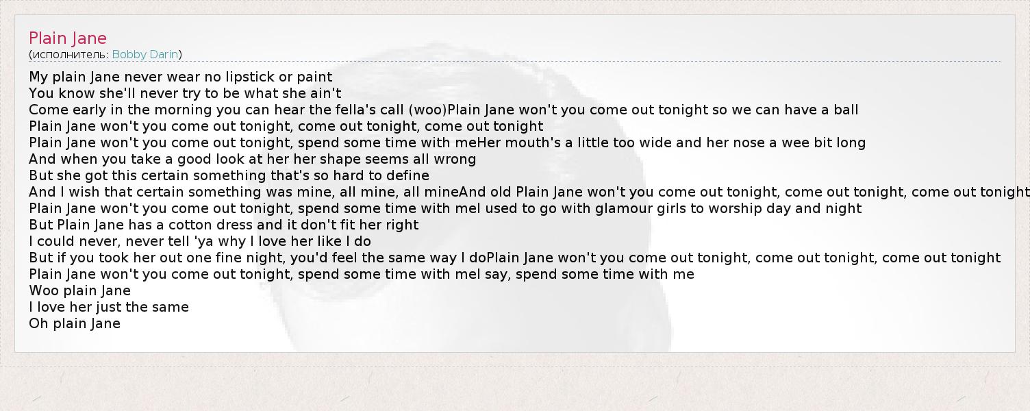 My plain Jane never wear no lipstick or paint You know she'll never try to be what she ain't Come early in the morning you can hear the fella's call (woo)Plain Jane won't you come out tonight so we can have a ball Plain Jane won't you come out tonight, come out tonight, come out tonight Plain Jane won't you come out tonight, spend some time with meHer mouth's a little too wide and her nose a wee bit long And when you take a good look at her her shape seems all wrong But she got this certain something that's so hard to define And I wish that certain something was mine, all mine, all mineAnd old Plain Jane won't you come out tonight, come out tonight, come out tonight Plain Jane won't you come out tonight, spend some time with meI used to go with glamour girls to worship day and night But Plain Jane has a cotton dress and it don't fit her right I could never, never tell 'ya why I love her like I do But if you took her out one fine night, you'd feel the same way I doPlain Jane won't you come out tonight, come out tonight, come out tonight Plain Jane won't you come out tonight, spend some time with meI say, spend some time with me Woo plain Jane I love her just the same Oh plain Jane