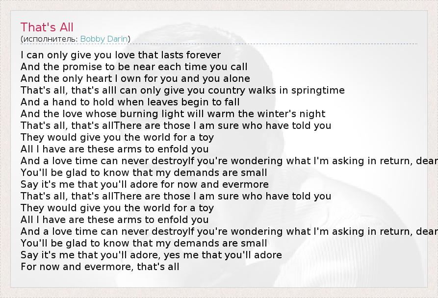 Это интересно:Бобби Дарин родился в Бронксе, Нью-Йорк — американский певец. Настоящее имя Уолден Роберт Кассотто (Walden Robert Cassotto).За те тридцать семь с половиной лет, которые судьба подарила Бобби Дарину, он успел не так мало: пел рок-н-ролл, кантри и джаз, многократно поднимался на вершину американских и английских чартов, снимался в кино и удостоился премий Grammy и номинировался на Oscar, а также преуспел... продолжение