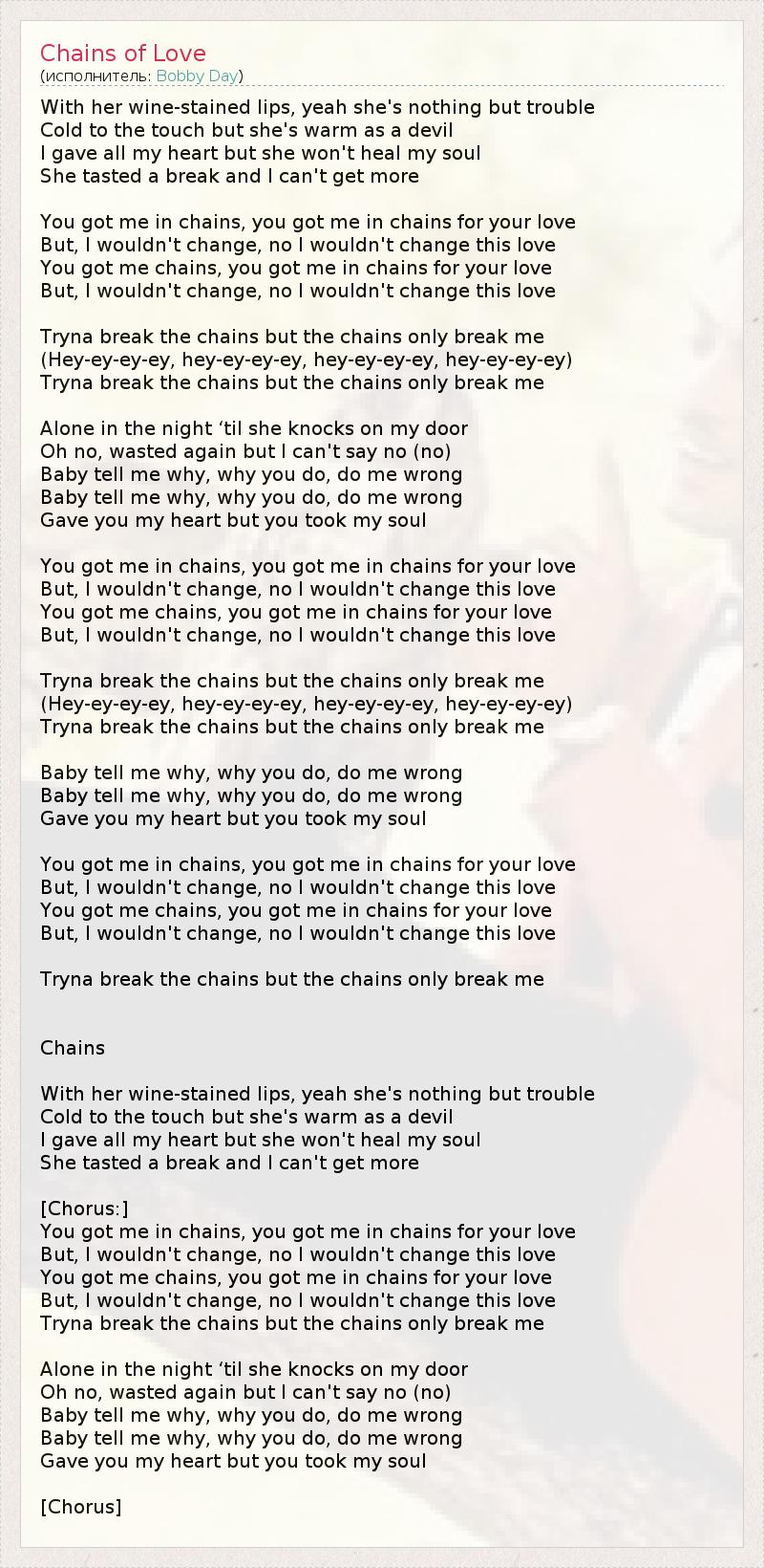 Ее губы цвета красного вина приносят только одни неприятности, Ее кожа холодна, как лед, но внутри нее пылает пламя. Я отдал ей свое сердце, но она не в силах исцелить мою душу, Она знает вкус свободы, и я не могу просить о большем. Ты приковала меня цепями, приковала словно цепями своей любовью, Но я бы не променял, нет, я бы не променял эту любовь. Ты приковала меня цепями, приковала словно цепями своей любовью, Но я бы не променял, нет, я бы не променял эту любовь. Пытаюсь разорвать цепи, да только цепи разрывают меня, (эй, эй, эй, эй) Пытаюсь разорвать цепи, да только цепи разрывают меня. Я провожу вечер в полном одиночестве, пока она не постучит в мою дверь. О, нет, она снова пьяна, но я не могу отказать ей. Детка, скажи мне, почему ты так со мной поступаешь? Детка, скажи мне, почему ты так со мной поступаешь? Я отдал тебе свое сердце, а ты завладела моей душой. Ты приковала меня цепями, приковала словно цепями своей любовью, Но я бы не променял, нет, я бы не променял эту любовь. Ты приковала меня цепями, приковала словно цепями своей любовью, Но я бы не променял, нет, я бы не променял эту любовь. Пытаюсь разорвать цепи, да только цепи разрывают меня, (эй, эй, эй, эй) Пытаюсь разорвать цепи, да только цепи разрывают меня. Детка, скажи мне, почему ты так со мной поступаешь? Детка, скажи мне, почему ты так со мной поступаешь? Я отдал тебе свое сердце, а ты завладела моей душой. Ты приковала меня цепями, приковала словно цепями своей любовью, Но я бы не променял, нет, я бы не променял эту любовь. Ты приковала меня цепями, приковала словно цепями своей любовью, Но я бы не променял, нет, я бы не променял эту любовь. Пытаюсь разорвать цепи, да только цепи разрывают меня. Цепи (перевод Ксения из Омска) Капли вина на губах – ох, беда мне с ней. Холодна к прикосновениям, но горяча, как дьявол. Я отдал ей все свое сердце, но она не исцелит мою душу. Она знает вкус свободы, и большего мне не добиться. [Припев:] Ты заковала меня в цепи, ты заковала меня в цепи своей любви. Но я бы не променял, нет, я бы не променял эту любовь ни на что. Ты заковала меня в цепи, ты заковала меня в цепи своей любви. Но я бы не променял, нет, я бы не променял эту любовь ни на что. Пытаюсь разорвать эти цепи, но они сами разрывают меня. Я один этой ночью, пока она не постучит в дверь. Я опять вдрызг пьян, но не могу сказать "нет". Малыш, скажи, за что, за что ты так со мной? Малыш, скажи, за что, за что ты так со мной? Я отдал тебе сердце, но ты забрала мою душу... [Припев]