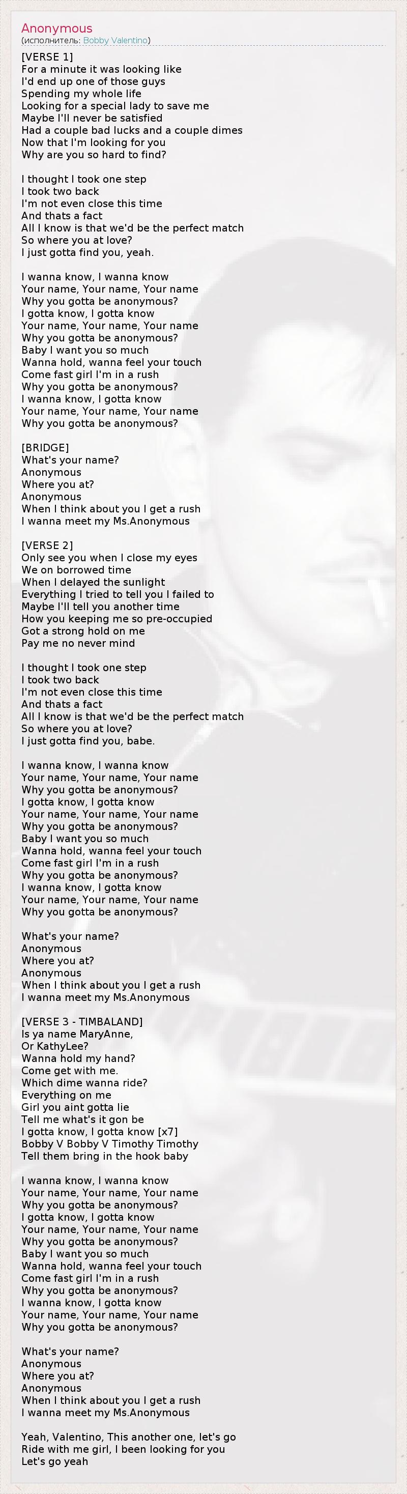 Это интересно:Bobby Valentino вырос, слушая Марвина Гэя, Стиви Уандера, Принца и использовал эту музыку на своем дебютном альбоме. Его целью было убрать все лишнее и вернуться к настоящему RnB. Несколько лет назад ко мне в руки попал компакт-диск малоизвестной RnB группы Mista и я никак не мог предположить, что некий Bobby Wilson, буквально через год-два выпустит свой сольный альбом, изменив фамилию на Valentino... продолжение