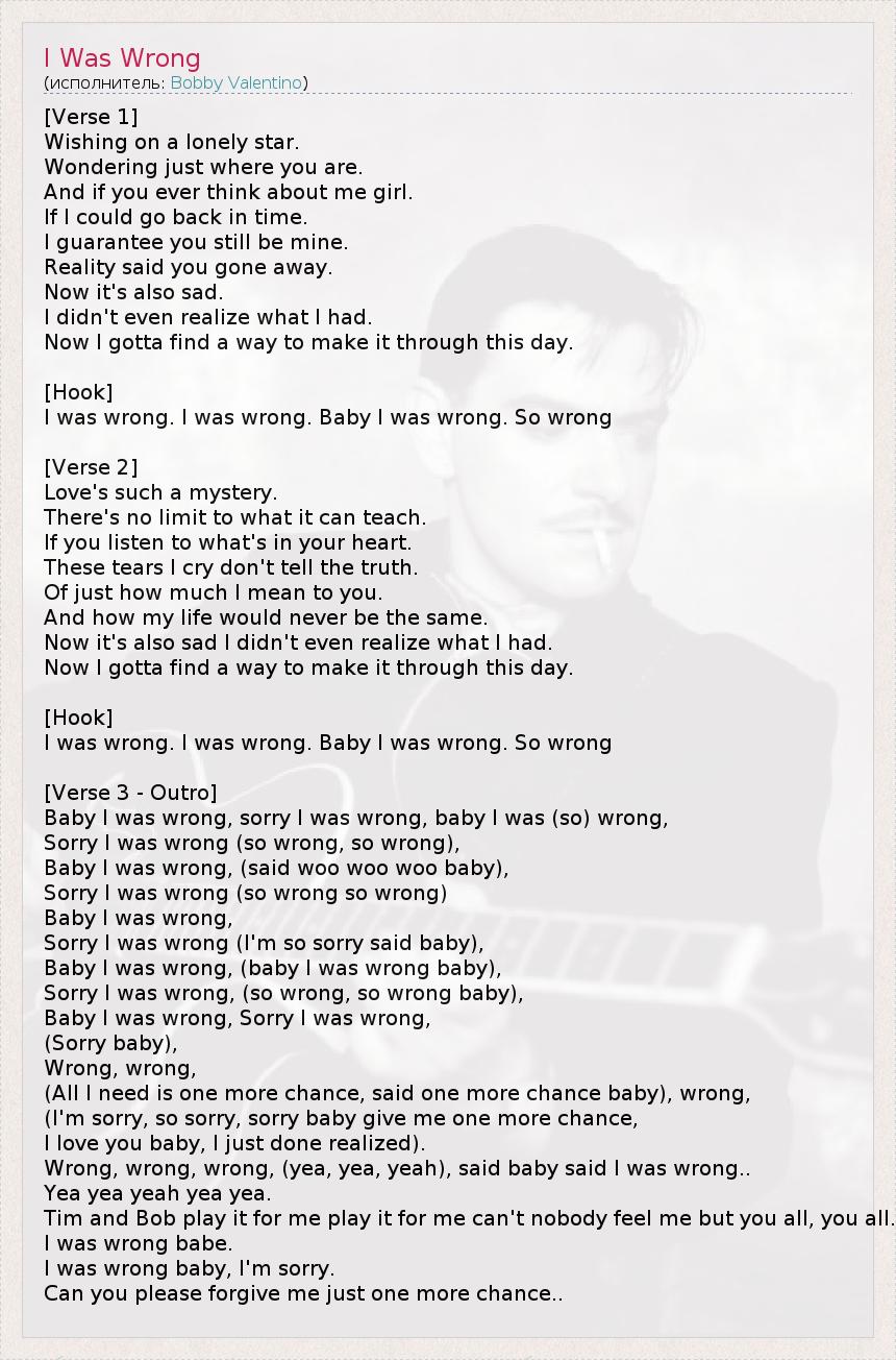 I was wrong. I was wrong. Baby I was wrong. So wrong