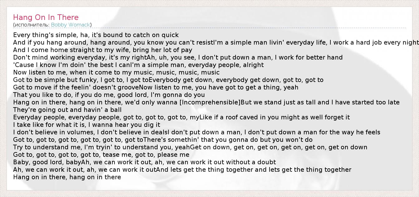 Это интересно:Бобби Уомак (Bobby Womack, полное имя Robert Dwayne Womack, 4 марта 1944 - 27 июня 2014) — афроамериканский певец, гитарист, автор песен в стилистке ритм-энд-блюза. В начале 1960-х записывался вместе со своими братьями в составе коллектива Womack Brothers. Их продюсером выступал великий Сэм Кук, после убийства которого Уомак изумил многих поклонников, женившись на его вдове Барбаре. (Младший брат Бобби впоследствии взял... продолжение