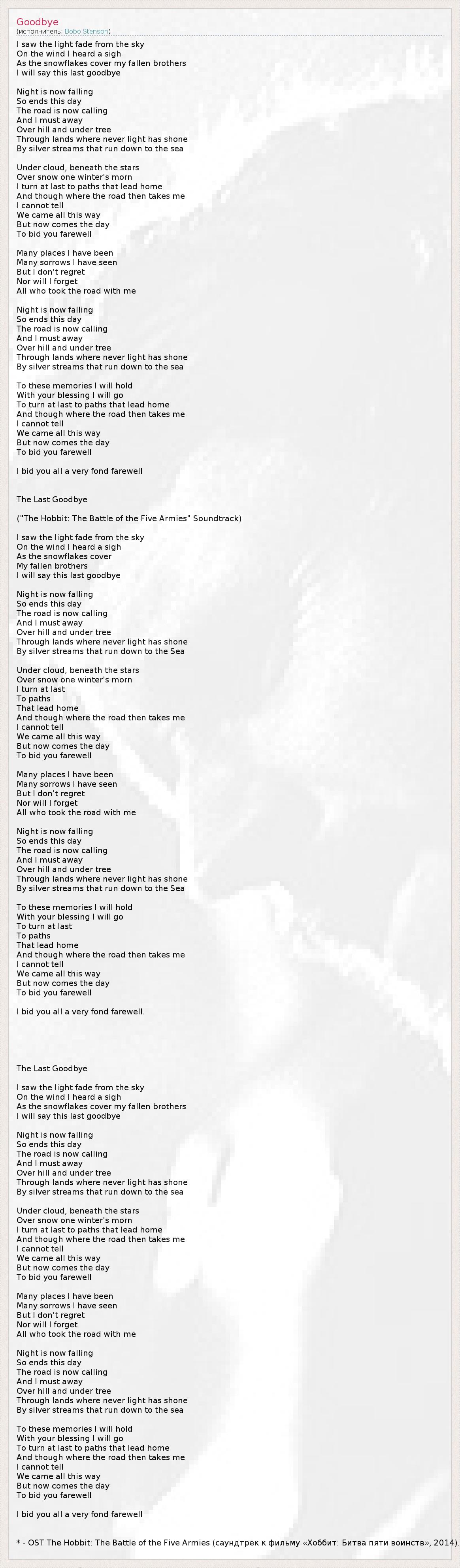 Я видел, как в небе растаял свет, Я слышал вздох в порыве ветра. Когда снежинки укроют моих павших братьев, Я скажу своё последнее "прощайте". Вот и опускается ночь, Завершая этот день. Дорога зовёт, И я должен уходить За холмы и за деревья, Через земли, куда никогда не пробивался солнечный свет, Следуя за серебряными ручьями, которые впадают в море. Под облаками и звёздами, Сквозь снежную завесу одним зимним утром Я наконец обернусь в сторону тропинок, которые ведут к дому. И хотя куда дорога забросит меня дальше, Я не знаю, Мы все пришли сюда вместе, Но теперь настаёт время Прощаться. Побывал я во многих краях, Повидал я многие печали, Но ни о чём не жалею, Равно как не забуду Всех, кто разделил этот путь со мной. Вот и опускается ночь, Завершая этот день. Дорога зовёт, И я должен уходить За холмы и за деревья, Через земли, куда никогда не пробивался солнечный свет, Следуя за серебряными ручьями, которые впадают в море. К воспоминаниям, что буду беречь, Я отправлюсь с вашим благословлением, Чтобы наконец обернуться в сторону тропинок, которые ведут к дому. И хотя куда дорога забросит меня дальше, Я не знаю, Мы все пришли сюда вместе, Но теперь настаёт время Прощаться. Я с любовью прощаюсь со всеми вами. Последнее прости** (перевод Григорий Войнер из Санкт-Петербурга) (Песня из фильма "Хоббит: Битва Пяти Воинств") Я видел: свет с небес уйти Решил. А после ветер стих. И снежной мглой объятым Моим павшим братьям Я скажу последнее "прости". Ночь на пороге Сгущает мрак. Зовёт дорога, И мне пора. Через леса и по горам, Там, где всегда царила мгла, И где стремятся к морю реки серебра, Под сенью туч, под светом звёзд, Сквозь искристый снег зимой Я вновь вернусь, Мой путь Ведёт домой. И где проляжет дорога моя, Не знаю я. Прошли мы весь путь, Те дни не вернуть, Я прощаюсь, друзья. Много где я побывал, Много бед я повидал, Но судьбу не виню, И в сердце храню Всех, кто путь делил со мной. Ночь на пороге Сгущает мрак. Зовёт дорога, И мне пора - Через леса и по горам, Там, где всегда царила мгла, И где стремятся к морю реки серебра. В сердце память удержу, Но, простите, ухожу. Я не вернусь, Мой путь Ведёт домой. И где проляжет дорога моя, Не знаю я. Прошли мы весь путь, Те дни не вернуть, Я прощаюсь, друзья. С любовью - вам моё последнее "прости". ** поэтический (эквиритмический) перевод с элементами творческой интерпретации Прощания час*** (перевод Fab Flute) Увидел я, свет вдруг погас, Я услышал ветра глас. Снежный полог ляжет на братьев павших, И прощусь в последний раз. Ночь наступает, День этот стих, И путь ждёт, я знаю, Пора мне идти За холмы и за туман, По тем краям, где правит тьма, За ручейки, что спешат в океан. В облаках горит звезда, Зимним утром в снежный шторм Я обернусь к тропе в родной дом. Куда же теперь, не знаю, Забросит нас, Был дружен наш стан, Но нынче настал Прощания час. Побывал я много где, Повидал я много бед, Но былого не жаль, Вы со мной шли вдаль, Не забыть мне вас вовек. Ночь наступает, День этот стих, И путь ждёт, я знаю, Пора мне идти За холмы и за туман, По тем краям, где правит тьма, За ручейки, что спешат в океан. Я запомню на потом Ваше слово и добро И обернусь к тропе в родной дом. Куда же теперь, не знаю, Забросит нас, Был дружен наш стан, Но нынче настал Прощания час. Любя всех вас, приму прощанья час. *** Поэтический (эквиритмический) перевод.