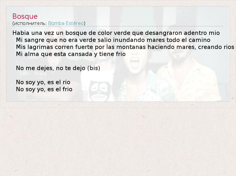 Это интересно:Группа образовалась в 2005 году в Боготе. Первоначально выступали с живыми концертами и гастролировали по Колумбии, c 2008 по 2013 годы приняли участие в музыкальных фестивалях и выступили с концертами во многих странах мира, вышло несколько альбомов группы. В 2009 году песня Fuego использована в игре «FIFA 10». Та же песня в 2011 году стала лейтмотивом аргентинского телесериала «El puntero esru». В 2011 году... продолжение