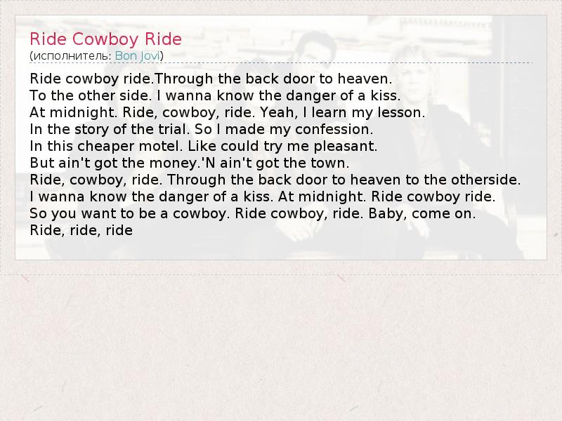 Ride cowboy ride.Through the back door to heaven. To the other side. I wanna know the danger of a kiss. At midnight. Ride, cowboy, ride. Yeah, I learn my lesson. In the story of the trial. So I made my confession. In this cheaper motel. Like could try me pleasant. But ain't got the money.'N ain't got the town. Ride, cowboy, ride. Through the back door to heaven to the otherside. I wanna know the danger of a kiss. At midnight. Ride cowboy ride. So you want to be a cowboy. Ride cowboy, ride. Baby, come on. Ride, ride, ride