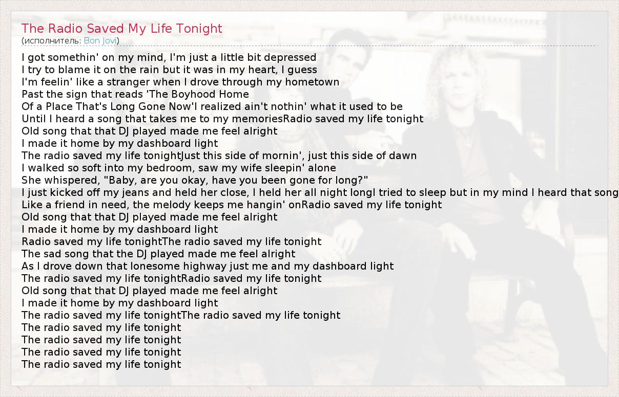 ГлавнаяИсполнителиBon JoviThe Radio Saved My Life Tonight