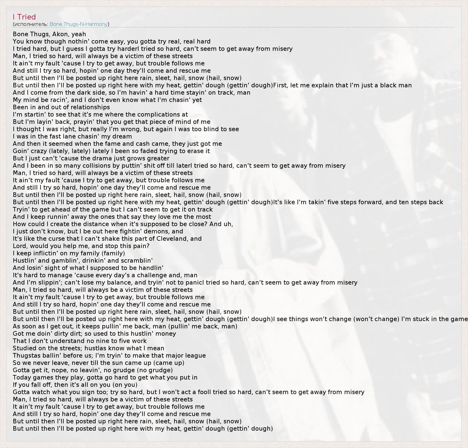 I tried hard, but I guess I gotta try harderI tried so hard, can't seem to get away from misery