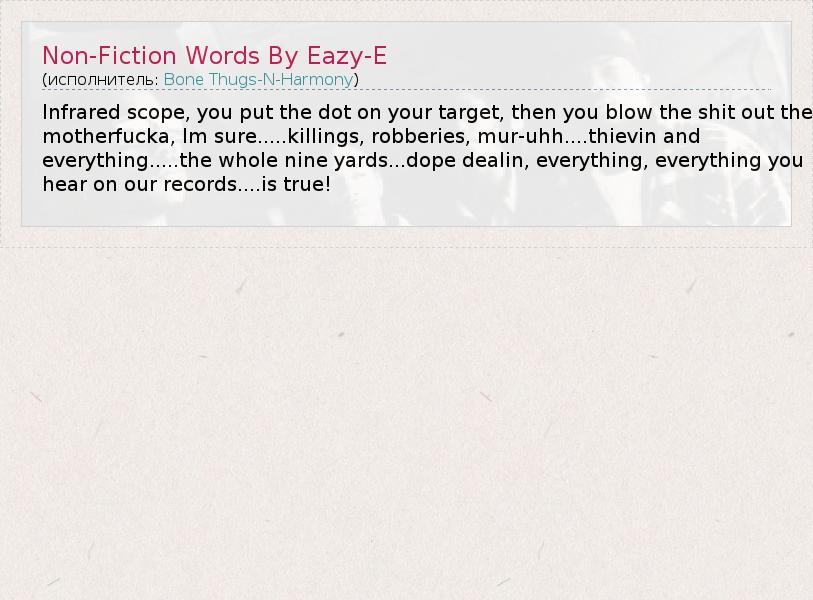 А как ты думаешь, о чем песня "Non-Fiction Words By Eazy-E" ?