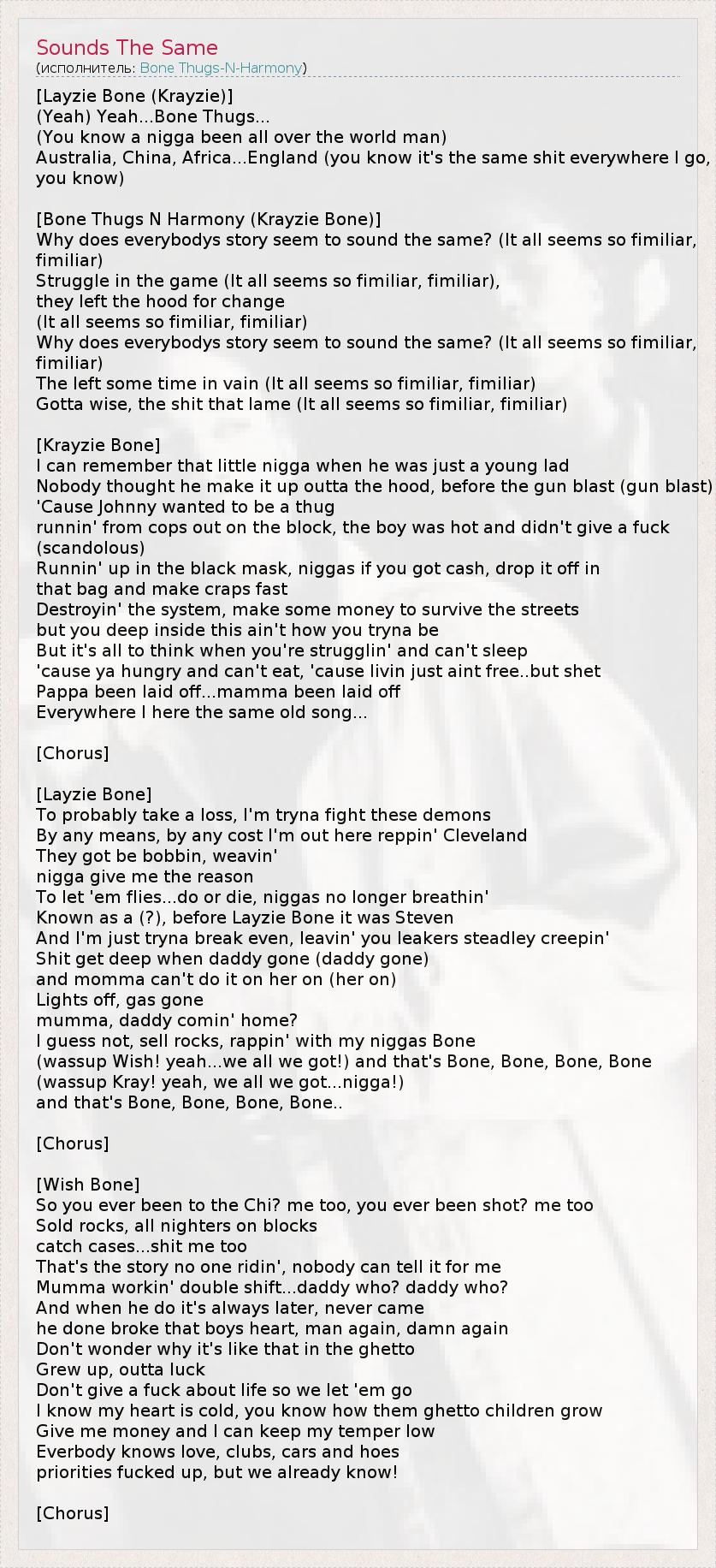 Это интересно:Bone Thugs-N-Harmony впервые поразили сцену в начале 90-ых годов. Собрав сбережения, они отправились в Лос-Анджелес и прошли прослушивание по телефону для лейбла Eazy-E "Ruthless Records", но так и не дождались ответа. Вскоре после этого Layzie Bone, Krayzie Bone, Wish Bone, Bizzy Bone и Flesh-n-Bone получили свой первый реальный шанс... продолжение