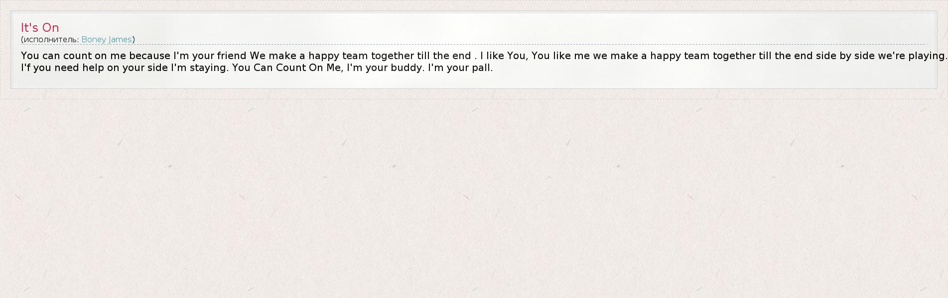 You can count on me because I'm your friend We make a happy team together till the end . I like You, You like me we make a happy team together till the end side by side we're playing. I'f you need help on your side I'm staying. You Can Count On Me, I'm your buddy. I'm your pall.