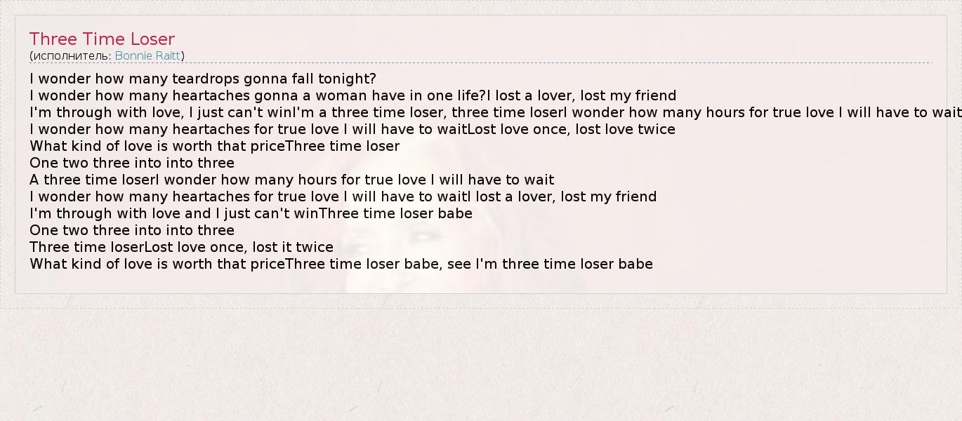 I'm through with love, I just can't winI'm a three time loser, three time loserI wonder how many hours for true love I will have to wait