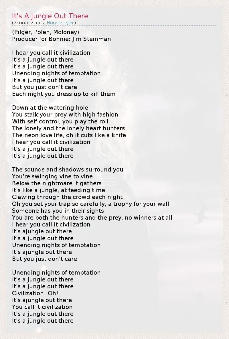 (Pilger, Polen, Moloney) Producer for Bonnie: Jim Steinman I hear you call it civilization It's a jungle out there It's a jungle out there Unending nights of temptation It's a jungle out there But you just don't care Each night you dress up to kill them Down at the watering hole You stalk your prey with high fashion With self control, you play the roll The lonely and the lonely heart hunters The neon love life, oh it cuts like a knife I hear you call it civilization It's a jungle out there It's a jungle out there The sounds and shadows surround you You're swinging vine to vine Below the nightmare it gathers It's like a jungle, at feeding time Clawing through the crowd each night Oh you set your trap so carefully, a trophy for your wall Someone has you in their sights You are both the hunters and the prey, no winners at all I hear you call it civilization It's ajungle out there It's a jungle out there Unending nights of temptation It's ajungle out there But you just don't care Unending nights of temptation It's a jungle out there It's a jungle out there Civilization! Oh! It's ajungle out there You call it civilization It's a jungle out there It's a jungle out there