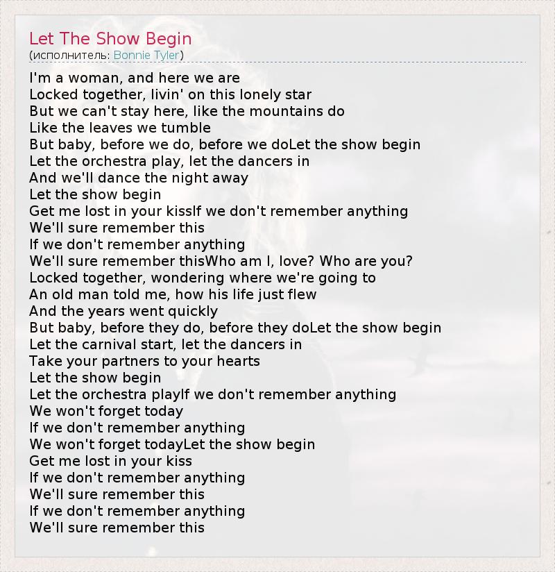 I'm a woman, and here we are Locked together, livin' on this lonely star But we can't stay here, like the mountains do Like the leaves we tumble But baby, before we do, before we doLet the show begin Let the orchestra play, let the dancers in And we'll dance the night away Let the show begin Get me lost in your kissIf we don't remember anything We'll sure remember this If we don't remember anything We'll sure remember thisWho am I, love? Who are you? Locked together, wondering where we're going to An old man told me, how his life just flew And the years went quickly But baby, before they do, before they doLet the show begin Let the carnival start, let the dancers in Take your partners to your hearts Let the show begin Let the orchestra playIf we don't remember anything We won't forget today If we don't remember anything We won't forget todayLet the show begin Get me lost in your kiss If we don't remember anything We'll sure remember this If we don't remember anything We'll sure remember this