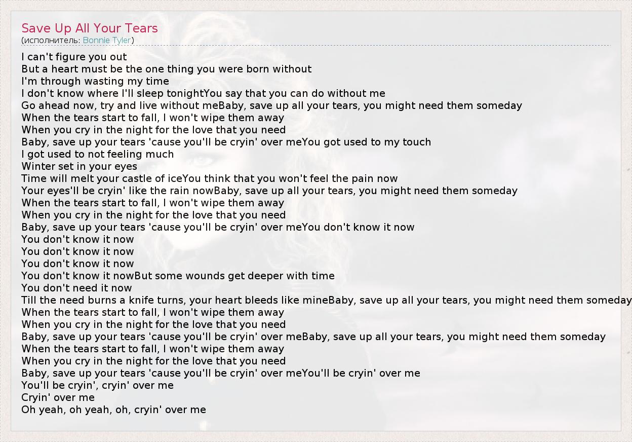 А как ты думаешь, о чем песня "Save Up All Your Tears" ?