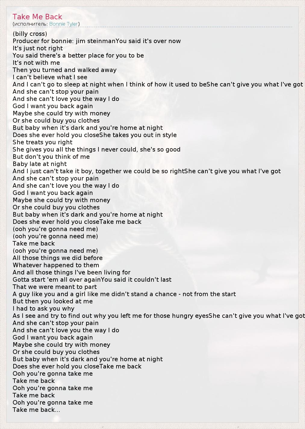 А как ты думаешь, о чем песня "Take Me Back" ?