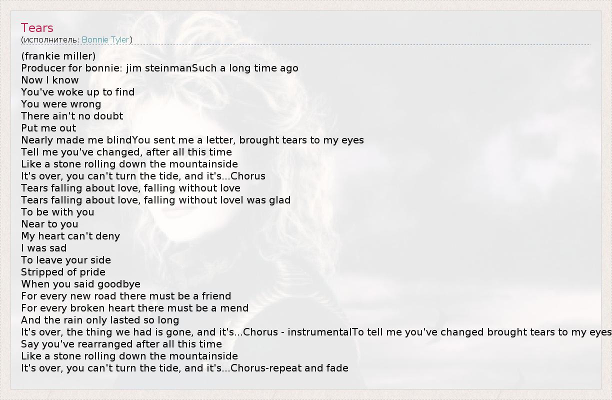 It's over, the thing we had is gone, and it's...Chorus - instrumentalTo tell me you've changed brought tears to my eyes
