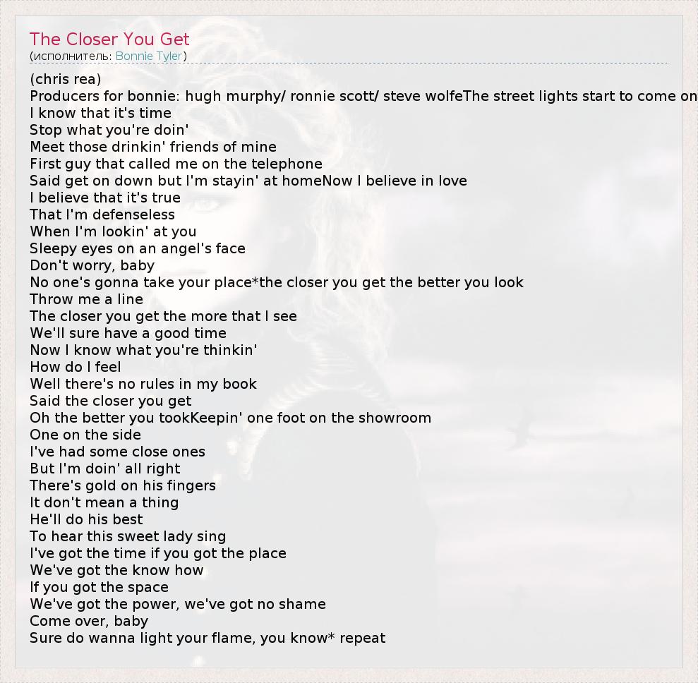 (chris rea) Producers for bonnie: hugh murphy/ ronnie scott/ steve wolfeThe street lights start to come on I know that it's time Stop what you're doin' Meet those drinkin' friends of mine First guy that called me on the telephone Said get on down but I'm stayin' at homeNow I believe in love I believe that it's true That I'm defenseless When I'm lookin' at you Sleepy eyes on an angel's face Don't worry, baby No one's gonna take your place*the closer you get the better you look Throw me a line The closer you get the more that I see We'll sure have a good time Now I know what you're thinkin' How do I feel Well there's no rules in my book Said the closer you get Oh the better you tookKeepin' one foot on the showroom One on the side I've had some close ones But I'm doin' all right There's gold on his fingers It don't mean a thing He'll do his best To hear this sweet lady sing I've got the time if you got the place We've got the know how If you got the space We've got the power, we've got no shame Come over, baby Sure do wanna light your flame, you know* repeat