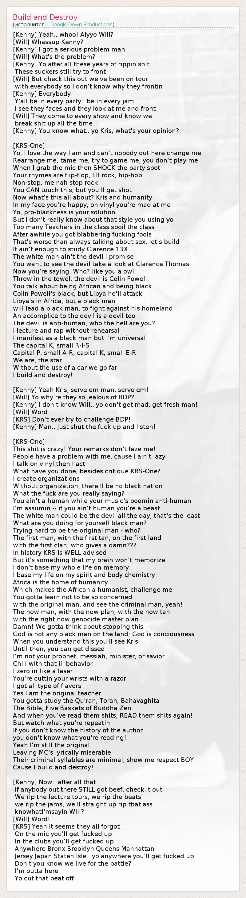 [Kenny] Yeah.. whoo! Aiyyo Will? [Will] Whassup Kenny? [Kenny] I got a serious problem man [Will] What's the problem? [Kenny] Yo after all these years of rippin shit These suckers still try to front! [Will] But check this out we've been on tour with everybody so I don't know why they frontin [Kenny] Everybody! Y'all be in every party I be in every jam I see they faces and they look at me and front [Will] They come to every show and know we break shit up all the time [Kenny] You know what.. yo Kris, what's your opinion? [KRS-One] Yo, I love the way I am and can't nobody out here change me Rearrange me, tame me, try to game me, you don't play me When I grab the mic then SHOCK the party spot Your rhymes are flip-flop, I'll rock, hip-hop Non-stop, me nah stop rock You CAN touch this, but you'll get shot Now what's this all about? Kris and humanity In my face you're happy, on vinyl you're mad at me Yo, pro-blackness is your solution But I don't really know about that style you using yo Too many Teachers in the class spoil the class After awhile you got blabbering fucking fools That's worse than always talking about sex, let's build It ain't enough to study Clarence 13X The white man ain't the devil I promise You want to see the devil take a look at Clarence Thomas Now you're saying, Who? like you a owl Throw in the towel, the devil is Colin Powell You talk about being African and being black Colin Powell's black, but Libya he'll attack Libya's in Africa, but a black man will lead a black man, to fight against his homeland An accomplice to the devil is a devil too The devil is anti-human, who the hell are you? I lecture and rap without rehearsal I manifest as a black man but I'm universal The capital K, small R-I-S Capital P, small A-R, capital K, small E-R We are, the star Without the use of a car we go far I build and destroy! [Kenny] Yeah Kris, serve em man, serve em! [Will] Yo why're they so jealous of BDP? [Kenny] I don't know Will.. yo don't get mad, get fresh man! [Will] Word [KRS] Don't ever try to challenge BDP! [Kenny] Man.. just shut the fuck up and listen! [KRS-One] This shit is crazy! Your remarks don't faze me! People have a problem with me, cause I ain't lazy I talk on vinyl then I act What have you done, besides critique KRS-One? I create organizations Without organization, there'll be no black nation What the fuck are you really saying? You ain't a human while your music's boomin anti-human I'm assumin -- if you ain't human you're a beast The white man could be the devil all the day, that's the least What are you doing for yourself black man? Trying hard to be the original man - who? The first man, with the first tan, on the first land with the first clan, who gives a damn???! In history KRS is WELL advised But it's something that my brain won't memorize I don't base my whole life on memory I base my life on my spirit and body chemistry Africa is the home of humanity Which makes the African a humanist, challenge me You gotta learn not to be so concerned with the original man, and see the criminal man, yeah! The now man, with the now plan, with the now tan with the right now genocide master plan Damn! We gotta think about stopping this God is not any black man on the land; God is conciousness When you understand this you'll see Kris Until then, you can get dissed I'm not your prophet, messiah, minister, or savior Chill with that ill behavior I zero in like a laser You're cuttin your wrists with a razor I got all type of flavors Yes I am the original teacher You gotta study the Qu'ran, Torah, Bahavaghita The Bible, Five Baskets of Buddha Zen And when you've read them shits, READ them shits again! But watch what you're repeatin If you don't know the history of the author you don't know what you're reading! Yeah I'm still the original Leaving MC's lyrically miserable Their criminal syllables are minimal, show me respect BOY Cause I build and destroy! [Kenny] Now.. after all that if anybody out there STILL got beef, check it out We rip the lecture tours, we rip the beats we rip the jams, we'll straight up rip that ass knowhatI'msayin Will? [Will] Word! [KRS] Yeah it seems they all forgot On the mic you'll get fucked up In the clubs you'll get fucked up Anywhere Bronx Brooklyn Queens Manhattan Jersey Japan Staten Isle.. yo anywhere you'll get fucked up Don't you know we live for the battle? I'm outta here Yo cut that beat off