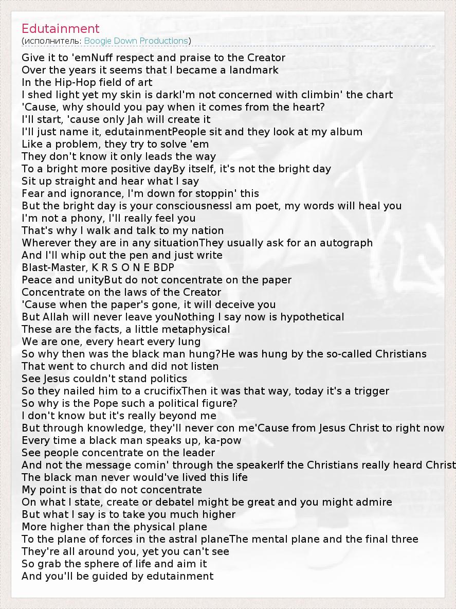 Give it to 'emNuff respect and praise to the Creator Over the years it seems that I became a landmark In the Hip-Hop field of art I shed light yet my skin is darkI'm not concerned with climbin' the chart 'Cause, why should you pay when it comes from the heart? I'll start, 'cause only Jah will create it I'll just name it, edutainmentPeople sit and they look at my album Like a problem, they try to solve 'em They don't know it only leads the way To a bright more positive dayBy itself, it's not the bright day Sit up straight and hear what I say Fear and ignorance, I'm down for stoppin' this But the bright day is your consciousnessI am poet, my words will heal you I'm not a phony, I'll really feel you That's why I walk and talk to my nation Wherever they are in any situationThey usually ask for an autograph And I'll whip out the pen and just write Blast-Master, K R S O N E BDP Peace and unityBut do not concentrate on the paper Concentrate on the laws of the Creator 'Cause when the paper's gone, it will deceive you But Allah will never leave youNothing I say now is hypothetical These are the facts, a little metaphysical We are one, every heart every lung So why then was the black man hung?He was hung by the so-called Christians That went to church and did not listen See Jesus couldn't stand politics So they nailed him to a crucifixThen it was that way, today it's a trigger So why is the Pope such a political figure? I don't know but it's really beyond me But through knowledge, they'll never con me'Cause from Jesus Christ to right now Every time a black man speaks up, ka-pow See people concentrate on the leader And not the message comin' through the speakerIf the Christians really heard Christ The black man never would've lived this life My point is that do not concentrate On what I state, create or debateI might be great and you might admire But what I say is to take you much higher More higher than the physical plane To the plane of forces in the astral planeThe mental plane and the final three They're all around you, yet you can't see So grab the sphere of life and aim it And you'll be guided by edutainment