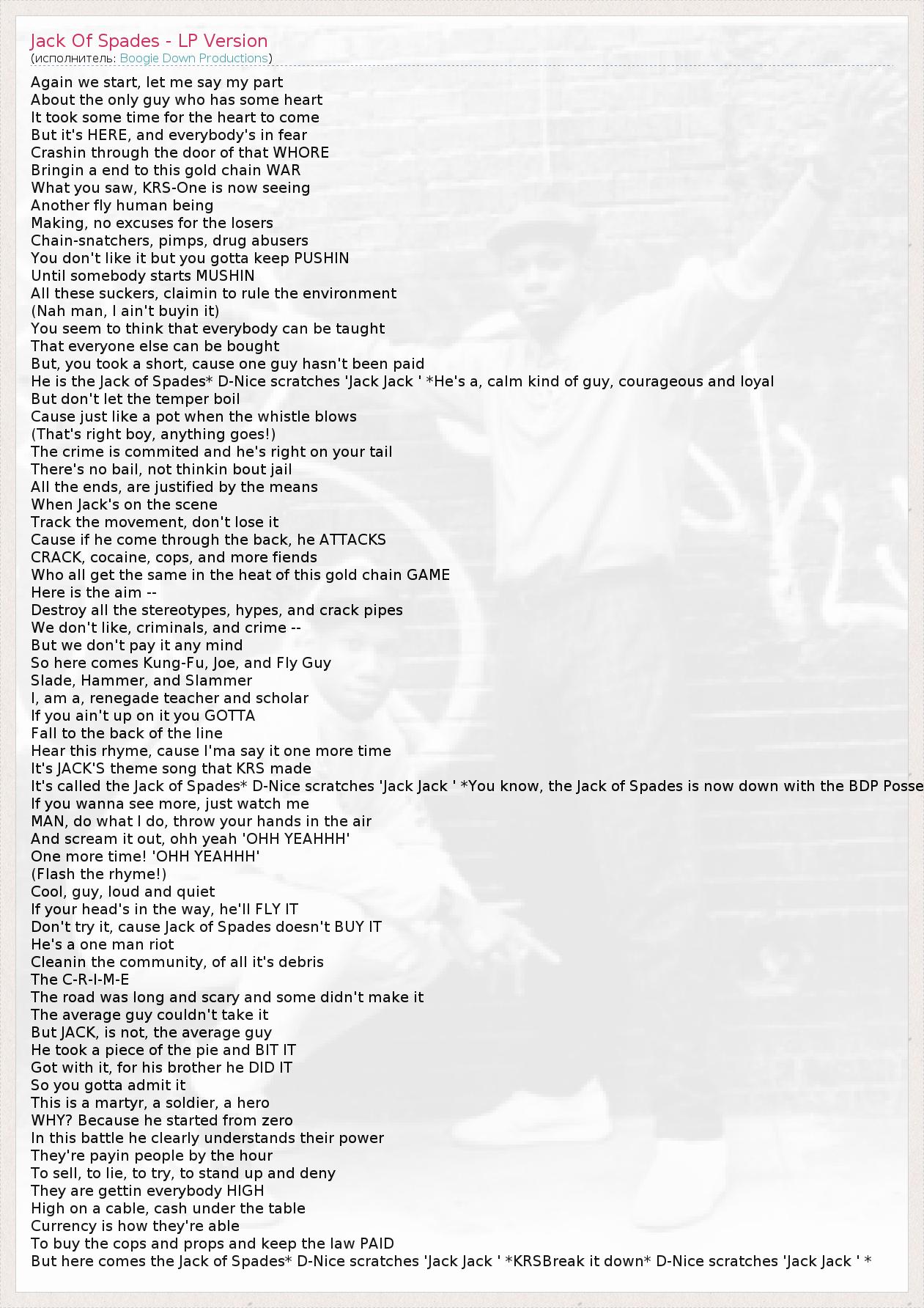 Again we start, let me say my part About the only guy who has some heart It took some time for the heart to come But it's HERE, and everybody's in fear Crashin through the door of that WHORE Bringin a end to this gold chain WAR What you saw, KRS-One is now seeing Another fly human being Making, no excuses for the losers Chain-snatchers, pimps, drug abusers You don't like it but you gotta keep PUSHIN Until somebody starts MUSHIN All these suckers, claimin to rule the environment (Nah man, I ain't buyin it) You seem to think that everybody can be taught That everyone else can be bought But, you took a short, cause one guy hasn't been paid He is the Jack of Spades* D-Nice scratches 'Jack Jack ' *He's a, calm kind of guy, courageous and loyal But don't let the temper boil Cause just like a pot when the whistle blows (That's right boy, anything goes!) The crime is commited and he's right on your tail There's no bail, not thinkin bout jail All the ends, are justified by the means When Jack's on the scene Track the movement, don't lose it Cause if he come through the back, he ATTACKS CRACK, cocaine, cops, and more fiends Who all get the same in the heat of this gold chain GAME Here is the aim -- Destroy all the stereotypes, hypes, and crack pipes We don't like, criminals, and crime -- But we don't pay it any mind So here comes Kung-Fu, Joe, and Fly Guy Slade, Hammer, and Slammer I, am a, renegade teacher and scholar If you ain't up on it you GOTTA Fall to the back of the line Hear this rhyme, cause I'ma say it one more time It's JACK'S theme song that KRS made It's called the Jack of Spades* D-Nice scratches 'Jack Jack ' *You know, the Jack of Spades is now down with the BDP Posse If you wanna see more, just watch me MAN, do what I do, throw your hands in the air And scream it out, ohh yeah 'OHH YEAHHH' One more time! 'OHH YEAHHH' (Flash the rhyme!) Cool, guy, loud and quiet If your head's in the way, he'll FLY IT Don't try it, cause Jack of Spades doesn't BUY IT He's a one man riot Cleanin the community, of all it's debris The C-R-I-M-E The road was long and scary and some didn't make it The average guy couldn't take it But JACK, is not, the average guy He took a piece of the pie and BIT IT Got with it, for his brother he DID IT So you gotta admit it This is a martyr, a soldier, a hero WHY? Because he started from zero In this battle he clearly understands their power They're payin people by the hour To sell, to lie, to try, to stand up and deny They are gettin everybody HIGH High on a cable, cash under the table Currency is how they're able To buy the cops and props and keep the law PAID But here comes the Jack of Spades* D-Nice scratches 'Jack Jack ' *KRSBreak it down* D-Nice scratches 'Jack Jack ' *