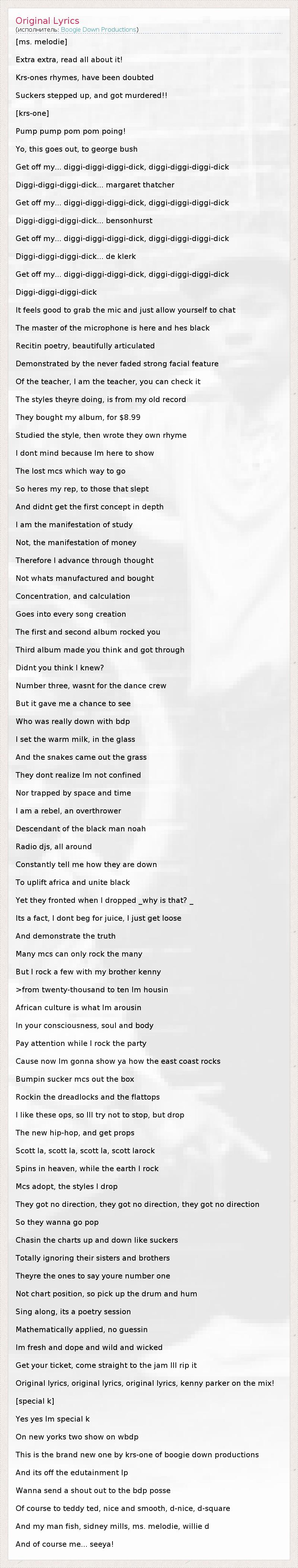 [ms. melodie] Extra extra, read all about it! Krs-ones rhymes, have been doubted Suckers stepped up, and got murdered!! [krs-one] Pump pump pom pom poing! Yo, this goes out, to george bush Get off my... diggi-diggi-diggi-dick, diggi-diggi-diggi-dick Diggi-diggi-diggi-dick... margaret thatcher Get off my... diggi-diggi-diggi-dick, diggi-diggi-diggi-dick Diggi-diggi-diggi-dick... bensonhurst Get off my... diggi-diggi-diggi-dick, diggi-diggi-diggi-dick Diggi-diggi-diggi-dick... de klerk Get off my... diggi-diggi-diggi-dick, diggi-diggi-diggi-dick Diggi-diggi-diggi-dick It feels good to grab the mic and just allow yourself to chat The master of the microphone is here and hes black Recitin poetry, beautifully articulated Demonstrated by the never faded strong facial feature Of the teacher, I am the teacher, you can check it The styles theyre doing, is from my old record They bought my album, for $8.99 Studied the style, then wrote they own rhyme I dont mind because Im here to show The lost mcs which way to go So heres my rep, to those that slept And didnt get the first concept in depth I am the manifestation of study Not, the manifestation of money Therefore I advance through thought Not whats manufactured and bought Concentration, and calculation Goes into every song creation The first and second album rocked you Third album made you think and got through Didnt you think I knew? Number three, wasnt for the dance crew But it gave me a chance to see Who was really down with bdp I set the warm milk, in the glass And the snakes came out the grass They dont realize Im not confined Nor trapped by space and time I am a rebel, an overthrower Descendant of the black man noah Radio djs, all around Constantly tell me how they are down To uplift africa and unite black Yet they fronted when I dropped _why is that? _ Its a fact, I dont beg for juice, I just get loose And demonstrate the truth Many mcs can only rock the many But I rock a few with my brother kenny >from twenty-thousand to ten Im housin African culture is what Im arousin In your consciousness, soul and body Pay attention while I rock the party Cause now Im gonna show ya how the east coast rocks Bumpin sucker mcs out the box Rockin the dreadlocks and the flattops I like these ops, so Ill try not to stop, but drop The new hip-hop, and get props Scott la, scott la, scott la, scott larock Spins in heaven, while the earth I rock Mcs adopt, the styles I drop They got no direction, they got no direction, they got no direction So they wanna go pop Chasin the charts up and down like suckers Totally ignoring their sisters and brothers Theyre the ones to say youre number one Not chart position, so pick up the drum and hum Sing along, its a poetry session Mathematically applied, no guessin Im fresh and dope and wild and wicked Get your ticket, come straight to the jam Ill rip it Original lyrics, original lyrics, original lyrics, kenny parker on the mix! [special k] Yes yes Im special k On new yorks two show on wbdp This is the brand new one by krs-one of boogie down productions And its off the edutainment lp Wanna send a shout out to the bdp posse Of course to teddy ted, nice and smooth, d-nice, d-square And my man fish, sidney mills, ms. melodie, willie d And of course me... seeya!