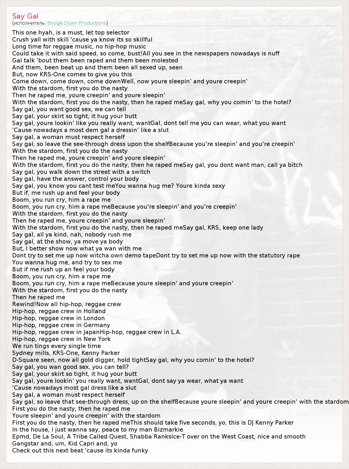 This one hyah, is a must, let top selector Crush yall with skill 'cause ya know its so skillful Long time for reggae music, no hip-hop music Could take it with said speed, so come, bust!All you see in the newspapers nowadays is nuff Gal talk 'bout them been raped and them been molested And them, been beat up and them been all sexed up, seen But, now KRS-One comes to give you this Come down, come down, come downWell, now youre sleepin' and youre creepin' With the stardom, first you do the nasty Then he raped me, youre creepin' and youre sleepin' With the stardom, first you do the nasty, then he raped meSay gal, why you comin' to the hotel? Say gal, you want good sex, we can tell Say gal, your skirt so tight, it hug your butt Say gal, youre lookin' like you really want, wantGal, dont tell me you can wear, what you want 'Cause nowadays a most dem gal a dressin' like a slut Say gal, a woman must respect herself Say gal, so leave the see-through dress upon the shelfBecause you're sleepin' and you're creepin' With the stardom, first you do the nasty Then he raped me, youre creepin' and youre sleepin' With the stardom, first you do the nasty, then he raped meSay gal, you dont want man, call ya bitch Say gal, you walk down the street with a switch Say gal, have the answer, control your body Say gal, you know you cant test meYou wanna hug me? Youre kinda sexy But if, me rush up and feel your body Boom, you run cry, him a rape me Boom, you run cry, him a rape meBecause you're sleepin' and you're creepin' With the stardom, first you do the nasty Then he raped me, youre creepin' and youre sleepin' With the stardom, first you do the nasty, then he raped meSay gal, KRS, keep one lady Say gal, all ya kind, nah, nobody rush me Say gal, at the show, ya move ya body But, I better show now what ya wan with me Dont try to set me up now witcha own demo tapeDont try to set me up now with the statutory rape You wanna hug me, and try to sex me But if me rush up an feel your body Boom, you run cry, him a rape me Boom, you run cry, him a rape meBecause youre sleepin' and youre creepin' With the stardom, first you do the nasty Then he raped me Rewind!Now all hip-hop, reggae crew Hip-hop, reggae crew in Holland Hip-hop, reggae crew in London Hip-hop, reggae crew in Germany Hip-hop, reggae crew in JapanHip-hop, reggae crew in L.A. Hip-hop, reggae crew in New York We run tings every single time Sydney mills, KRS-One, Kenny Parker D-Square seen, now all gold digger, hold tightSay gal, why you comin' to the hotel? Say gal, you wan good sex, you can tell? Say gal, your skirt so tight, it hug your butt Say gal, youre lookin' you really want, wantGal, dont say ya wear, what ya want 'Cause nowadays most gal dress like a slut Say gal, a woman must respect herself Say gal, so leave that see-through dress, up on the shelfBecause youre sleepin' and youre creepin' with the stardom First you do the nasty, then he raped me Youre sleepin' and youre creepin' with the stardom First you do the nasty, then he raped meThis should take five seconds, yo, this is DJ Kenny Parker In the house, I just wanna say, peace to my man Bizmarkie Epmd, De La Soul, A Tribe Called Quest, Shabba RanksIce-T over on the West Coast, nice and smooth Gangstar and, um, Kid Capri and, yo Check out this next beat 'cause its kinda funky