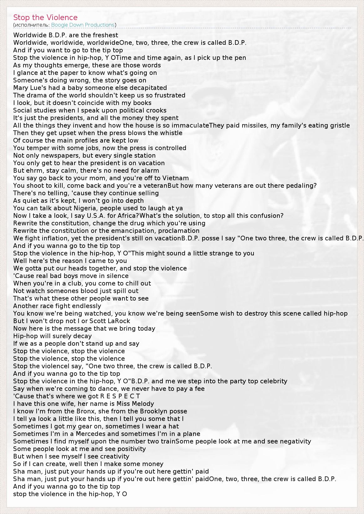 Stop the violenceI say, "One two three, the crew is called B.D.P.