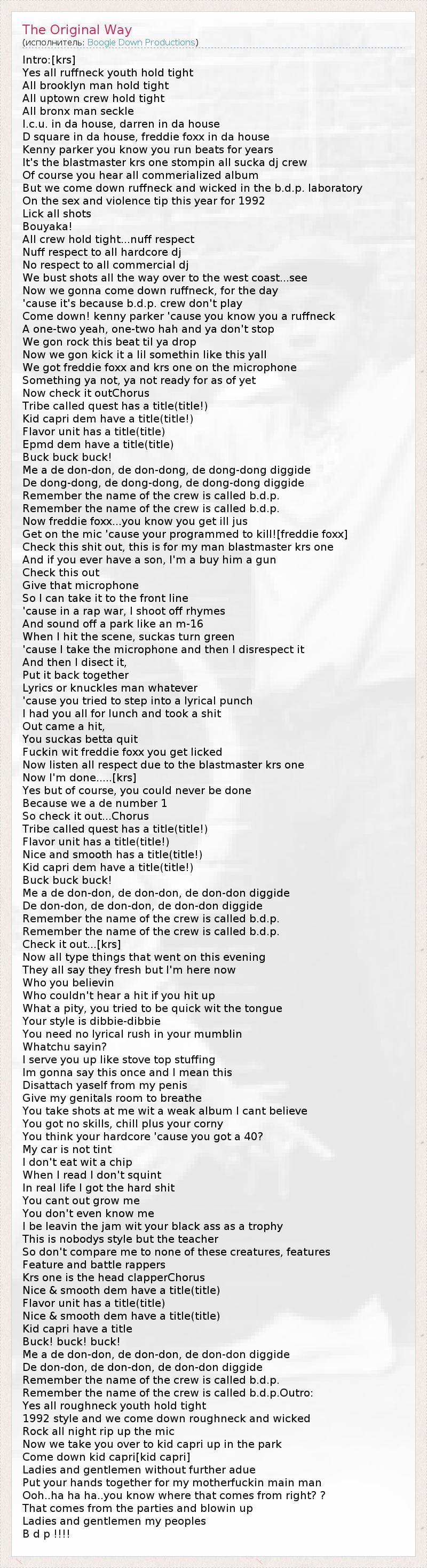 Это интересно:Крис Лоуренс Паркер (Kris Laurence Parker) родился 20 августа 1965 года в нью-йоркском квартале Парк Слэуп (Park Slope), который располагается в южной части Бруклина, и с детства был бунтарем. В 14 лет, чтобы избавиться от раздражающей опеки своей матери и дебильной системы нью-йоркских школ, он покинул отчий дом и много лет жил где попало, играл в баскетбол, увлекся граффити под псевдонимом KRS-One (это так называемый... продолжение