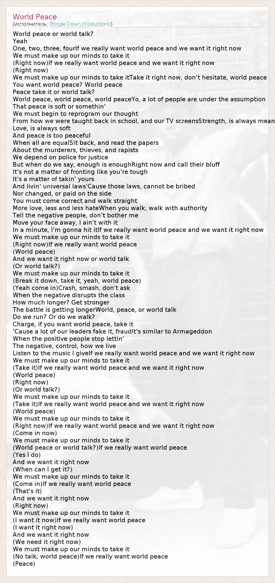World peace or world talk? Yeah One, two, three, fourIf we really want world peace and we want it right now We must make up our minds to take it (Right now)If we really want world peace and we want it right now (Right now) We must make up our minds to take itTake it right now, don't hesitate, world peace You want world peace? World peace Peace take it or world talk? World peace, world peace, world peaceYo, a lot of people are under the assumption That peace is soft or somethin' We must begin to reprogram our thought From how we were taught back in school, and our TV screensStrength, is always mean Love, is always soft And peace is too peaceful When all are equalSit back, and read the papers About the murderers, thieves, and rapists We depend on police for justice But when do we say, enough is enoughRight now and call their bluff It's not a matter of fronting like you're tough It's a matter of takin' yours And livin' universal laws'Cause those laws, cannot be bribed Nor changed, or paid on the side You must come correct and walk straight More love, less and less hateWhen you walk, walk with authority Tell the negative people, don't bother me Move your face away, I ain't with it In a minute, I'm gonna hit itIf we really want world peace and we want it right now We must make up our minds to take it (Right now)If we really want world peace (World peace) And we want it right now or world talk (Or world talk?) We must make up our minds to take it (Break it down, take it, yeah, world peace) (Yeah come in)Crash, smash, don't ask When the negative disrupts the class How much longer? Get stronger The battle is getting longerWorld, peace, or world talk Do we run? Or do we walk? Charge, if you want world peace, take it 'Cause a lot of our leaders fake it, fraudIt's similar to Armageddon When the positive people stop lettin' The negative, control, how we live Listen to the music I giveIf we really want world peace and we want it right now We must make up our minds to take it (Take it)If we really want world peace and we want it right now (World peace) (Right now) (Or world talk?) We must make up our minds to take it (Take it)If we really want world peace and we want it right now (World peace) We must make up our minds to take it (Right now)If we really want world peace and we want it right now (Come in now) We must make up our minds to take it (World peace or world talk?)If we really want world peace (Yes I do) And we want it right now (When can I get it?) We must make up our minds to take it (Come in)If we really want world peace (That's it) And we want it right now (Right now) We must make up our minds to take it (I want it now)If we really want world peace (I want it right now) And we want it right now (We need it right now) We must make up our minds to take it (No talk, world peace)If we really want world peace (Peace)