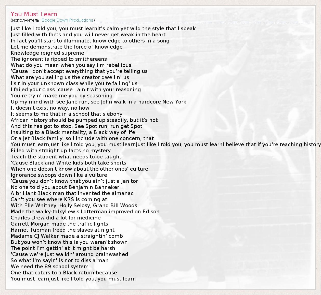 Just like I told you, you must learnIt's calm yet wild the style that I speak Just filled with facts and you will never get weak in the heart In fact you'll start to illuminate, knowledge to others in a song Let me demonstrate the force of knowledge Knowledge reigned supreme The ignorant is ripped to smithereens What do you mean when you say I'm rebellious 'Cause I don't accept everything that you're telling us What are you selling us the creator dwellin' us I sit in your unknown class while you're failing' us I failed your class 'cause I ain't with your reasoning You're tryin' make me you by seasoning Up my mind with see Jane run, see John walk in a hardcore New York It doesn't exist no way, no how It seems to me that in a school that's ebony African history should be pumped up steadily, but it's not And this has got to stop, See Spot run, run get Spot Insulting to a Black mentality, a Black way of life Or a jet Black family, so I include with one concern, that You must learnJust like I told you, you must learnJust like I told you, you must learnI believe that if you're teaching history Filled with straight up facts no mystery Teach the student what needs to be taught 'Cause Black and White kids both take shorts When one doesn't know about the other ones' culture Ignorance swoops down like a vulture 'Cause you don't know that you ain't just a janitor No one told you about Benjamin Banneker A brilliant Black man that invented the almanac Can't you see where KRS is coming at With Elie Whitney, Holly Selosy, Grand Bill Woods Made the walky-talkyLewis Latterman improved on Edison Charles Drew did a lot for medicine Garrett Morgan made the traffic lights Harriet Tubman freed the slaves at night Madame CJ Walker made a straightin' comb But you won't know this is you weren't shown The point I'm gettin' at it might be harsh 'Cause we're just walkin' around brainwashed So what I'm sayin' is not to diss a man We need the 89 school system One that caters to a Black return because You must learnJust like I told you, you must learn