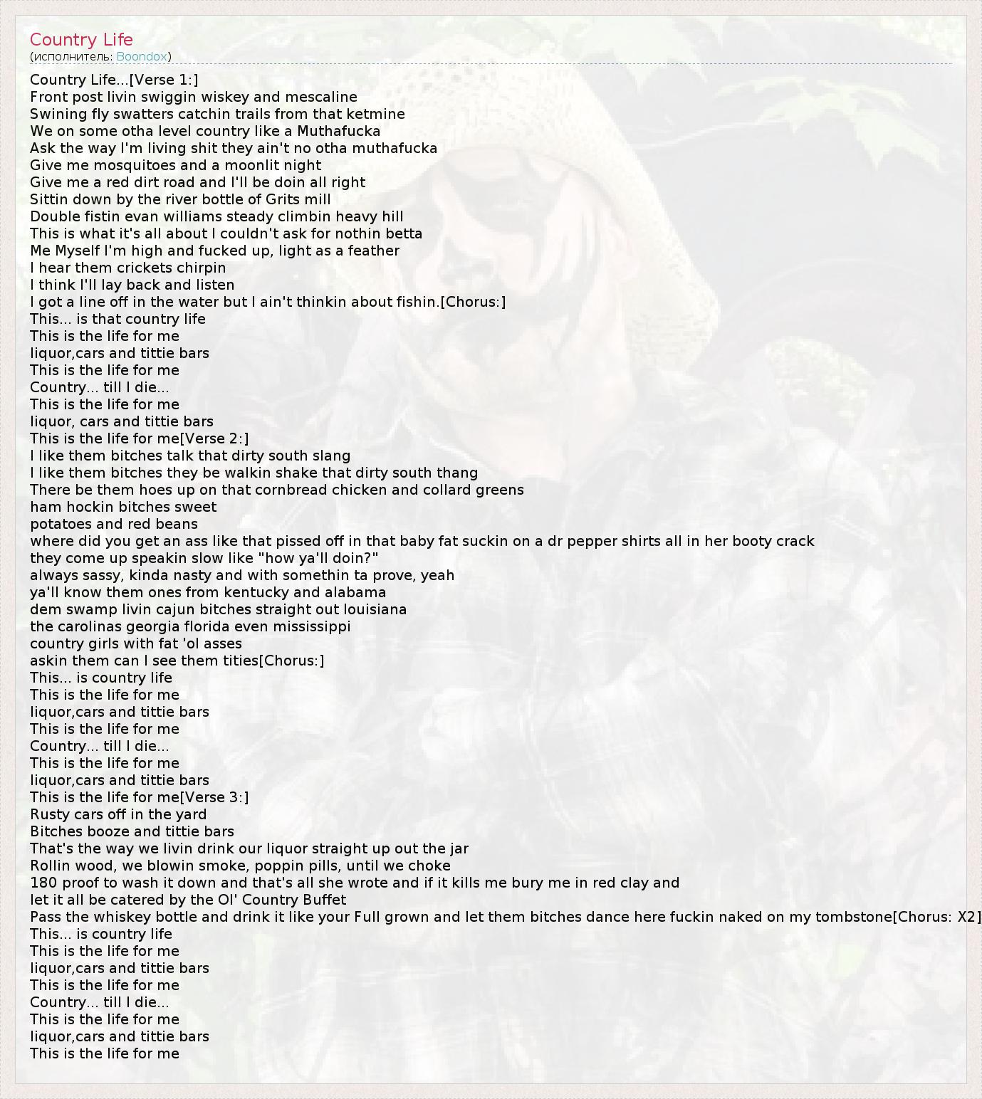 Country Life...[Verse 1:] Front post livin swiggin wiskey and mescaline Swining fly swatters catchin trails from that ketmine We on some otha level country like a Muthafucka Ask the way I'm living shit they ain't no otha muthafucka Give me mosquitoes and a moonlit night Give me a red dirt road and I'll be doin all right Sittin down by the river bottle of Grits mill Double fistin evan williams steady climbin heavy hill This is what it's all about I couldn't ask for nothin betta Me Myself I'm high and fucked up, light as a feather I hear them crickets chirpin I think I'll lay back and listen I got a line off in the water but I ain't thinkin about fishin.[Chorus:] This... is that country life This is the life for me liquor,cars and tittie bars This is the life for me Country... till I die... This is the life for me liquor, cars and tittie bars This is the life for me[Verse 2:] I like them bitches talk that dirty south slang I like them bitches they be walkin shake that dirty south thang There be them hoes up on that cornbread chicken and collard greens ham hockin bitches sweet potatoes and red beans where did you get an ass like that pissed off in that baby fat suckin on a dr pepper shirts all in her booty crack they come up speakin slow like "how ya'll doin?" always sassy, kinda nasty and with somethin ta prove, yeah ya'll know them ones from kentucky and alabama dem swamp livin cajun bitches straight out louisiana the carolinas georgia florida even mississippi country girls with fat 'ol asses askin them can I see them tities[Chorus:] This... is country life This is the life for me liquor,cars and tittie bars This is the life for me Country... till I die... This is the life for me liquor,cars and tittie bars This is the life for me[Verse 3:] Rusty cars off in the yard Bitches booze and tittie bars That's the way we livin drink our liquor straight up out the jar Rollin wood, we blowin smoke, poppin pills, until we choke 180 proof to wash it down and that's all she wrote and if it kills me bury me in red clay and let it all be catered by the Ol' Country Buffet Pass the whiskey bottle and drink it like your Full grown and let them bitches dance here fuckin naked on my tombstone[Chorus: X2] This... is country life This is the life for me liquor,cars and tittie bars This is the life for me Country... till I die... This is the life for me liquor,cars and tittie bars This is the life for me
