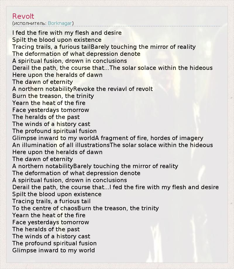 I fed the fire with my flesh and desire Spilt the blood upon existence Tracing trails, a furious tailBarely touching the mirror of reality The deformation of what depression denote A spiritual fusion, drown in conclusions Derail the path, the course that...The solar solace within the hideous Here upon the heralds of dawn The dawn of eternity A northern notabilityRevoke the reviavl of revolt Burn the treason, the trinity Yearn the heat of the fire Face yesterdays tomorrow The heralds of the past The winds of a history cast The profound spiritual fusion Glimpse inward to my worldA fragment of fire, hordes of imagery An illumination of all illustrationsThe solar solace within the hideous Here upon the heralds of dawn The dawn of eternity A northern notabilityBarely touching the mirror of reality The deformation of what depression denote A spiritual fusion, drown in conclusions Derail the path, the course that...I fed the fire with my flesh and desire Spilt the blood upon existence Tracing trails, a furious tail To the centre of chaosBurn the treason, the trinity Yearn the heat of the fire Face yesterdays tomorrow The heralds of the past The winds of a history cast The profound spiritual fusion Glimpse inward to my world