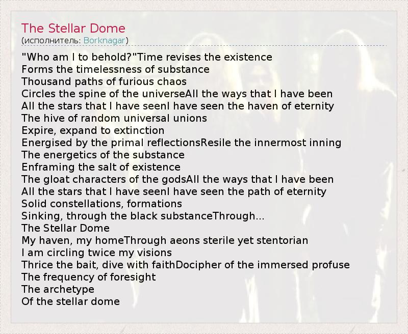 "Who am I to behold?"Time revises the existence Forms the timelessness of substance Thousand paths of furious chaos Circles the spine of the universeAll the ways that I have been All the stars that I have seenI have seen the haven of eternity The hive of random universal unions Expire, expand to extinction Energised by the primal reflectionsResile the innermost inning The energetics of the substance Enframing the salt of existence The gloat characters of the godsAll the ways that I have been All the stars that I have seenI have seen the path of eternity Solid constellations, formations Sinking, through the black substanceThrough... The Stellar Dome My haven, my homeThrough aeons sterile yet stentorian I am circling twice my visions Thrice the bait, dive with faithDocipher of the immersed profuse The frequency of foresight The archetype Of the stellar dome